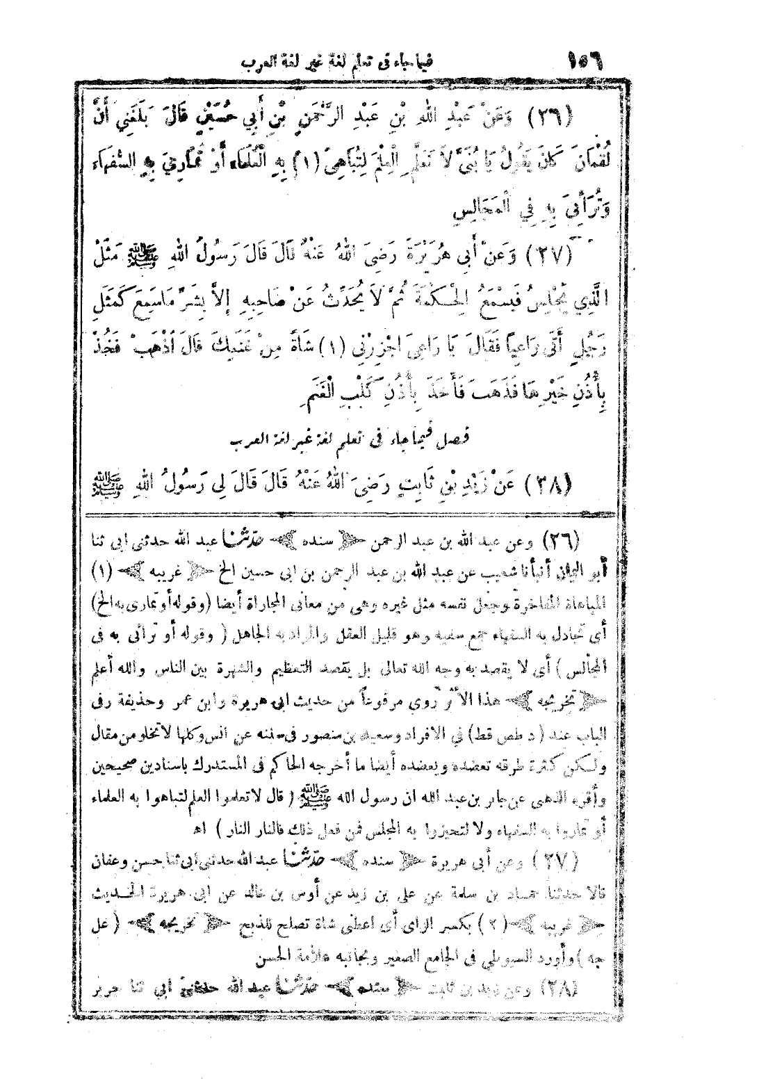 (26) وعن عبد الله بن عبدالرحمن {سنده} حدثنا عبدالله حدثنى ابى ثنا ابو اليمان انبأنا شعيب عن عبدالله بن عبدالرحمن بن ابى حسين الخ {غريبة} (1) المباهاة المفاخرة وجعل نفسه مثل غيره وهى من معانى المجاراة ايضا (وقوله او تمارى به الخ) اى تجادل به السفهاء جمع سفيه وهو قليل العقل والمراد به الجاهل (وقوله او ترائى به فى المجالس) أى لا يقصد به وجه الله تعلاى بل يقصد التعظيم والشهرة بين الناس والله اعلم {تخريجه} هذا الاثر روى مرفوعا من حديث ابى هريرة وابن عمر وحذيفة وفى الباب عند (د طص قط) فى الافراد وسعيد بن منصور فى سننه عن انس وكلها لا تخلو من مقال ولكن كثرة طرقة تعضده ايضا ما اخرجه الحاك فى المستدرك باسنادين صحيحين واقر الذهبى عن جابر بن عبدالله ان رسول الله صلى الله عليه وسلم (قال لا تعلموا العلم لتباهوا به العلماء او تماروا به السفهاء ولا تتحيزوا به المجالس فمن فعل ذلك فالنار النار) اهـ