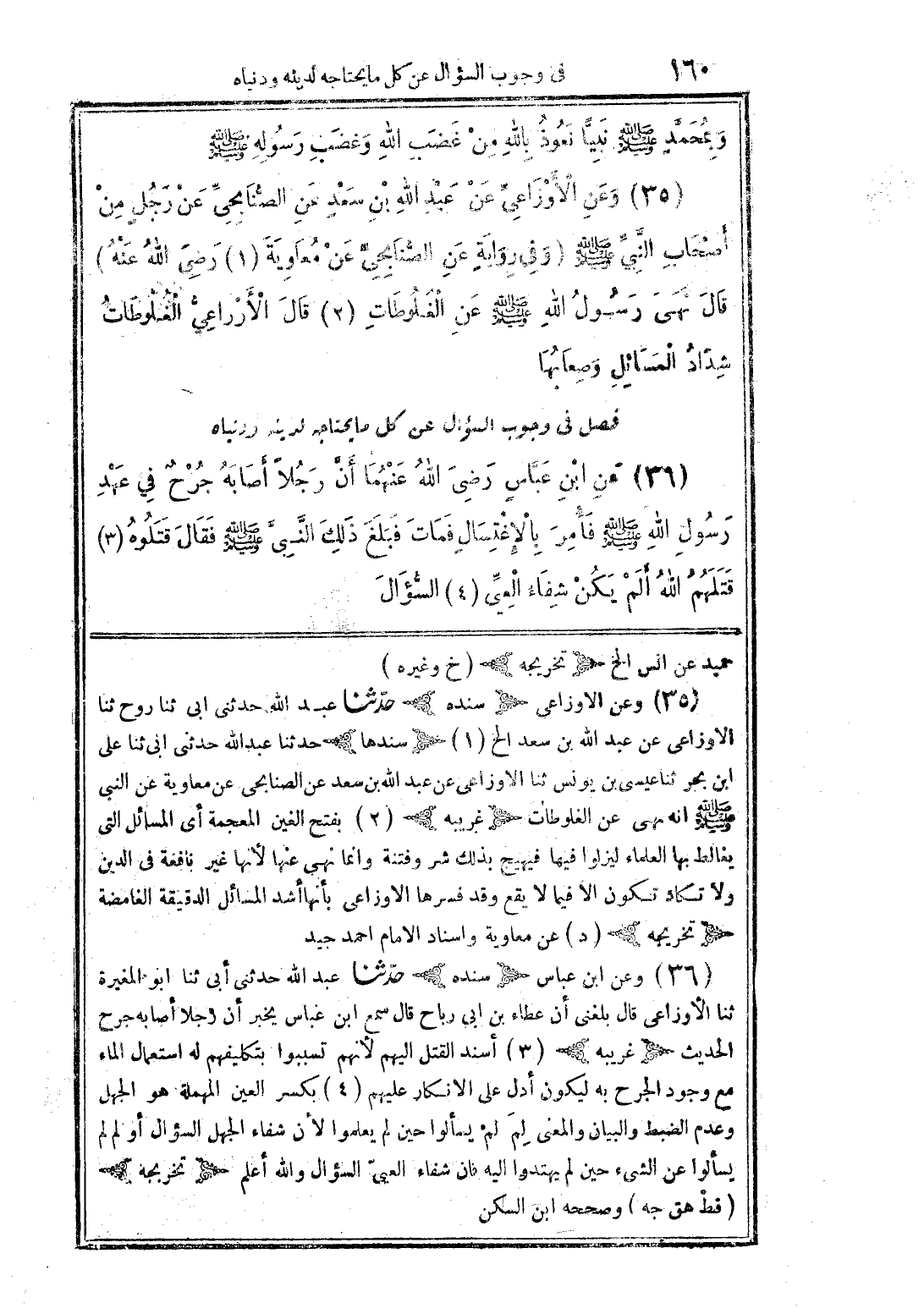 (36) عن ابْنَ عَبَّاسٍ رضى الله عنهما أَنَّ رَجُلًا أَصَابَهُ جُرْحٌ فِي عَهْدِ رَسُولِ اللَّهِ صَلَّى اللَّهُ عَلَيْهِ وَسَلَّمَ ثُمَّ أَصَابَهُ احْتِلَامٌ فَأُمِرَ بِالِاغْتِسَالِ فَمَاتَ فَبَلَغَ ذَلِكَ النَّبِيَّ صَلَّى اللَّهُ عَلَيْهِ وَسَلَّمَ فَقَالَ قَتَلُوهُ (3) قَتَلَهُمْ اللَّهُ أَلَمْ يَكُنْ شِفَاءَ الْعِيِّ (4) السُّؤَالُ