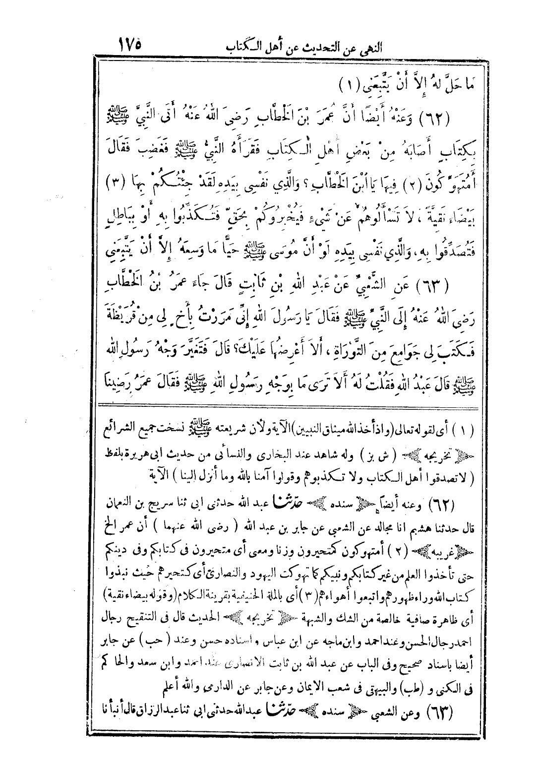 (62) وعنه ايضا ان عُمَرَ بْنَ الْخَطَّابِ رضى الله عنه أَتَى النَّبِيَّ صَلَّى اللَّهُ عَلَيْهِ وَسَلَّمَ بِكِتَابٍ أَصَابَهُ مِنْ بَعْضِ أَهْلِ الْكُتُبِ فَقَرَأَهُ النَّبِيُّ صَلَّى اللَّهُ عَلَيْهِ وَسَلَّمَ فَغَضِبَ فَقَالَ أَمُتَهَوِّكُونَ (2) فِيهَا يَا ابْنَ الْخَطَّابِ وَالَّذِي نَفْسِي بِيَدِهِ لَقَدْ جِئْتُكُمْ بِهَا (3) بَيْضَاءَ نَقِيَّةً لَا تَسْأَلُوهُمْ عَنْ شَيْءٍ فَيُخْبِرُوكُمْ بِحَقٍّ فَتُكَذِّبُوا بِهِ أَوْ بِبَاطِلٍ فَتُصَدِّقُوا بِهِ وَالَّذِي نَفْسِي بِيَدِهِ لَوْ أَنَّ مُوسَى صَلَّى اللَّهُ عَلَيْهِ وَسَلَّمَ كَانَ حَيًّا مَا وَسِعَهُ إِلَّا أَنْ يَتَّبِعَنِي