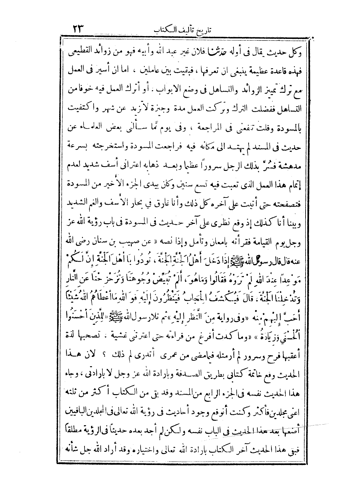 وكل حديث يقال في أوله حدثنا فلان غير عبد الله وأبيه فهو من زوائد القطيعي فهذه قاعدة عظيمة ينبغي أن تعرفها، فبقيت بين عاملين إما أن أسير في العمل مع ترك تمييز الزوائد والتساهل في وضع الأبواب، أو ترك العمل فيه خوفا من التساهل، ففضلت الترك، وتركت العمل مدة وجيزة لا تزيدعن شهر واكتفيت بالمسودة وقلت تنفعني في المراجعة، وفي يوم ما سألني بعض العلماء عن حديث في المسند لم يهتد الى مكانه فيه فراجعت المسودة واستخرجته بسرعة مدهشة، فسر بذلك الرجل سرورا عظيما وبعد ذهابي اعتراني اسف شديد لعدم اتمام هذا العمل الذي تعبت فيه تسع سنين وكان بيدي الجزء الاخير من المسودة فتصحفته حتى أتيت على آخره كل ذلك وأنا غارق في بحار الأسف والغم الشديد، وبينا أنا كذلك إذ وقع نظري على آخر حديث في المسودة في باب رؤية الله عز وجل يوم القيامة فقرأته بإمعان وتأمل وإذا نصه: {عن صهيب بن سنان رضي الله عنه قال قال رسول الله صلى الله عليه واله وصحبه وسلم: إذا دخل أهل الجنة الجنة، نودوا بأهل الجنة إن لكم موعدا عند الله لم تروه فقالوا: وما هو، ألم تبيض وجوهنا وتزحزحنا عن النار وتدخلنا الجنة، قال فيكشف الحجاب، فينظرون إليه فوالله ما أعطاهم الله شيئا أحب إليهم منه ((وفي رواية من النظر إليه)) ثم تلا رسول الله صلى الله عليه واله وصحبه وسلم {للذين أحسنوا الحسنى وزيادة}.، وما كدت أفرغ من قراءته حتى اعترتني غشية تصبحها لذه أعقبها فرح وسرور لم أر مثله فيما مضى من عمري، أتدري لم؟ لأنه هذا الحديث وقع خاتمة كتابي بطريق الصدفة وبإرادة الله عزوجل لا بإرادتي، وجاء الحديث نفسه في الجزء الرابع من المسند وقد بقى من الكتاب أكثر من ثلثه أعني مجلدين فأكثر، وكنت أتوقع وجود أحاديث في رؤية الله تعالى في المجلدين الباقيين أضعها بعد هذا الحديث في الباب نفسه ولكن لم أجد بعده حديثا في الرؤية مطلقا فبقي هذا الحديث في آخر الكتاب بإرادة الله تعالى واختياره وقد أراد الله جل شأنه