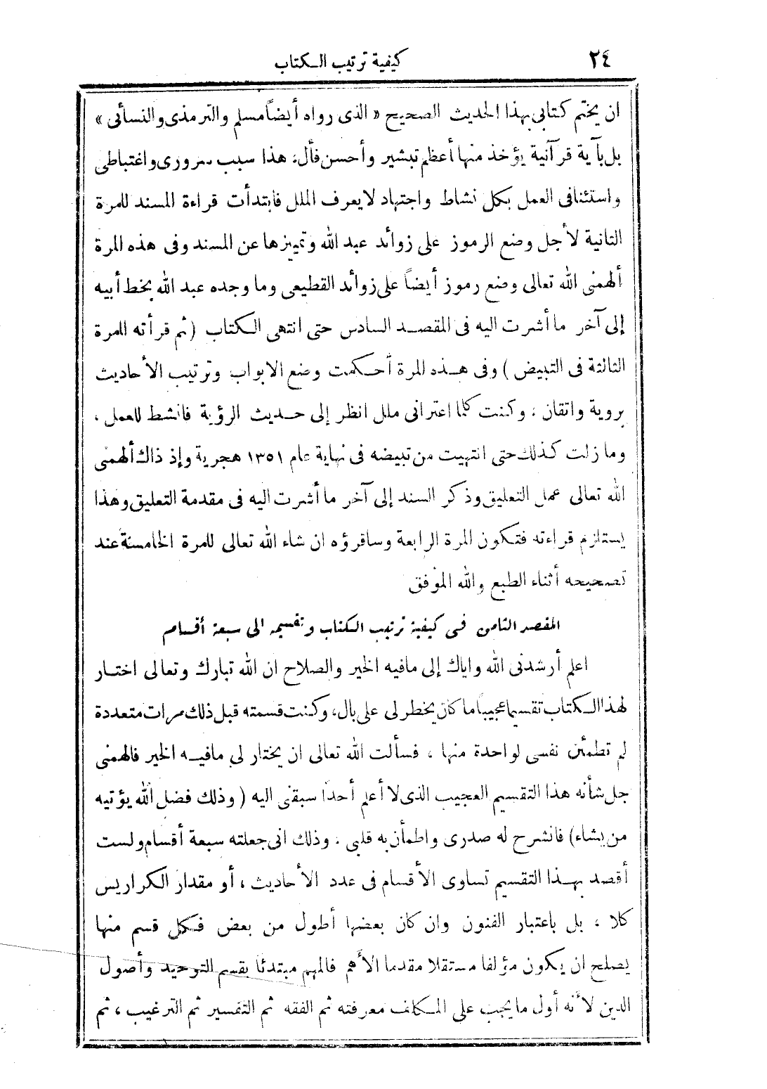اعلم أرشدني الله واياك الى ما فيه الخير والصلاح ان الله تعالى اختار لهذا الكتاب تقسيما عجيبا ما كان يخطر لي على بال، وكنت قسمته قبل ذلك مرات متعددة لم تطمئن نفسي لواحدة منها، فسألت الله تعالى أن يختار لي ما فيه الخير، فألهمني جل شأنه هذا التقسيم العجيب الذي لا أعلم أحدا سبقني إليه (وذلك فضل الله يؤتيه من يشاء) فانشرح له صدري واطمأن به قلبي، وذلك أني جعلته سبعة أقسام ولست أقصد بهذا التقسيم تساوي الأقسام في عدد الأحاديث، أو مقدار الكراريس كلا، بل باعتبار الفنون وان كان بعضها أطول من بعض فكل قسم منها يصلح أن يكون مؤلفا مستقلا مقدما الأهم فالمهم مبتدئا بقسم التوحيد وأصول الدين لأنه أول ما يجب على المكلف معرفته، ثم الفقه ثم التفسير ثم الترغيب ثم