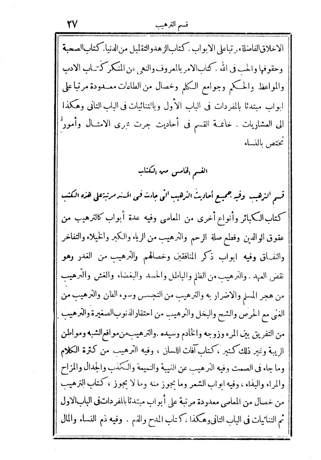 الأخلاق الفاضلة مرتبا على الأبواب، كتاب الزهد والتقليل من الدنيا، كتاب الصحبة وحقوقها والحب في الله تعالى، كتاب الأمر بالمعروف والنهي عن المنكر، كتاب الأدب والمواعظ والحكم وجوامع الكلم وخصال من الطاعات معدودة مرتبة على أبواب بالمفردات في الباب الأول وبالثنائيات في الباب الثاني وهكذا الى العشاريات، خاتمة القسم في أحاديث جرت مجرى الأمثال وأمور تختص بالنساء