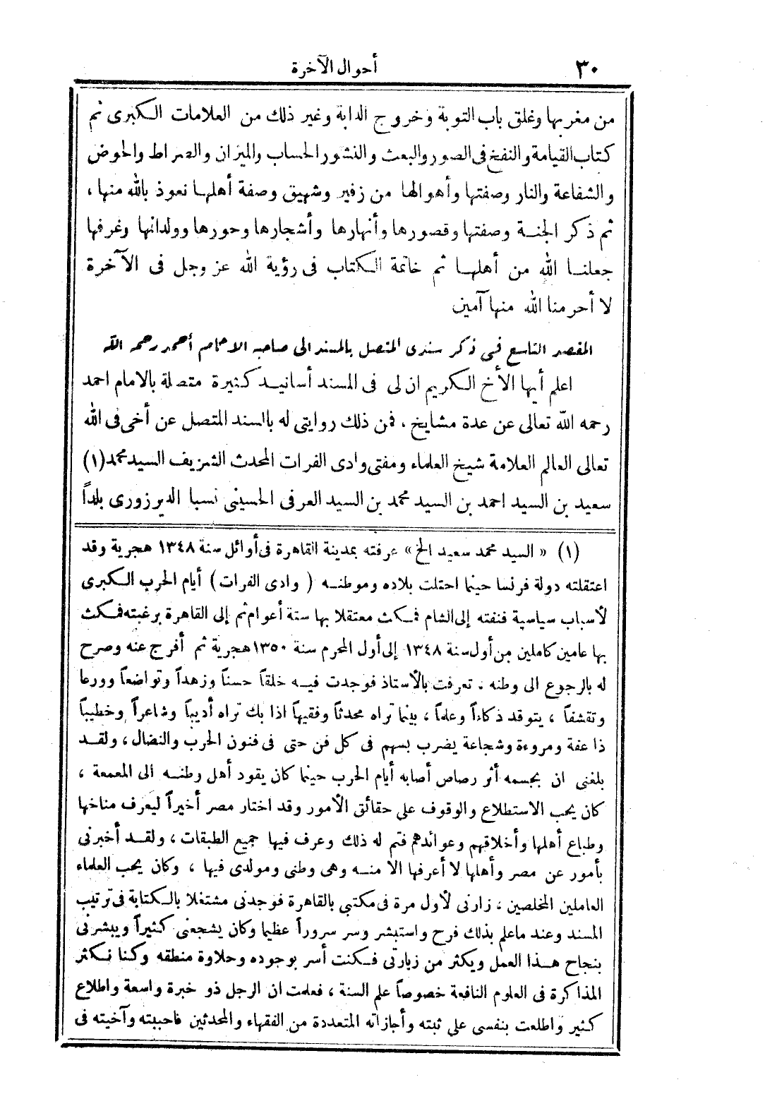 اعلم أخي الكريم ان لي في المسند أسانيد كثيرة متصلة بالامام احمد رحمه الله تعالى عن عدة مشايخ، فمن ذلك روايتي له بالسند المتصل عن أخي في الله تعالى العالم العلامة شيخ العلماء ومفتي وادي الفرات المحدث الشريف السيد محمد (1) سعيد بن السيد أحمد بن السيد محمد بن السيد العرفي الحسيني نسبا الديرزوري بلدًا