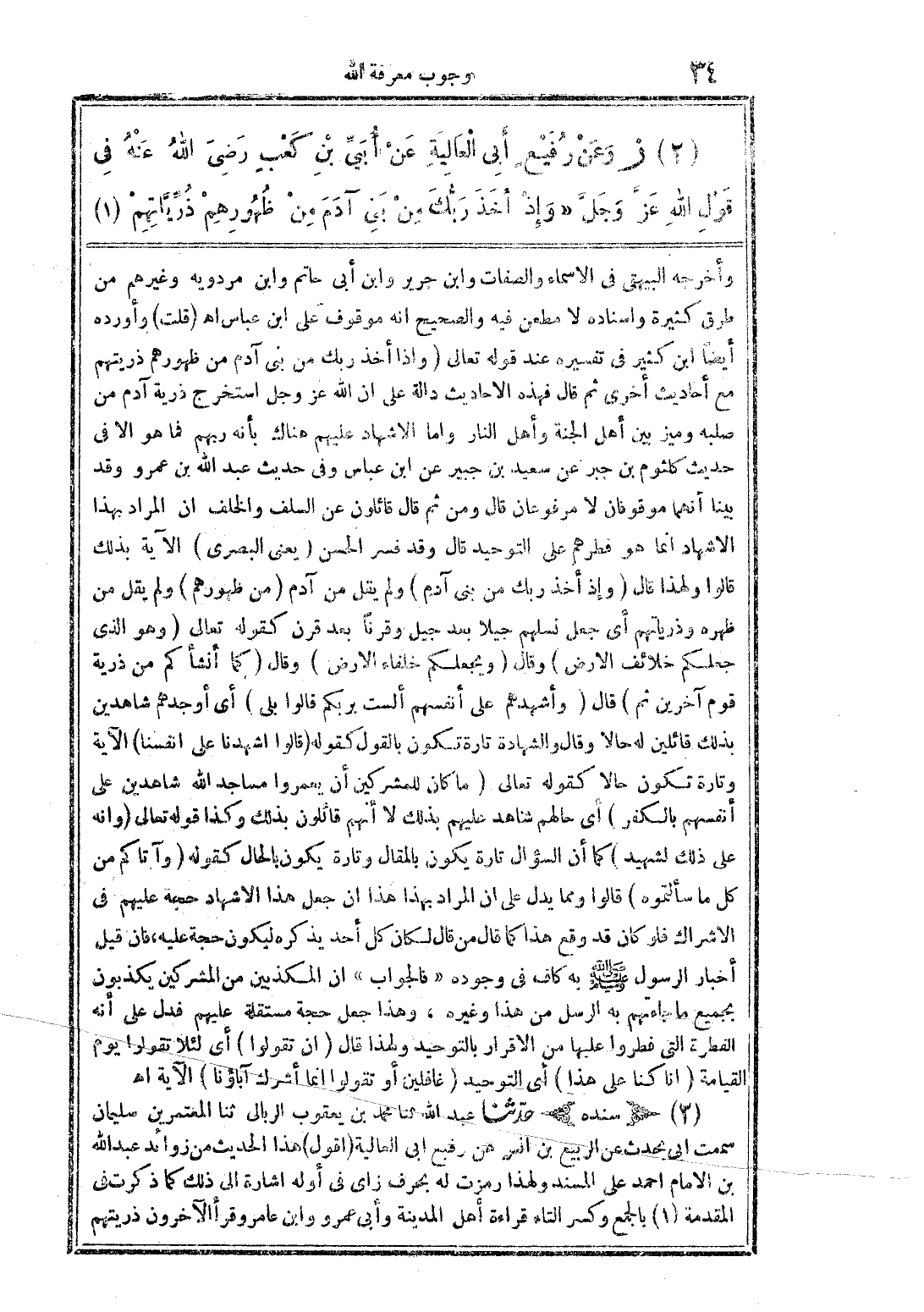 (2) ز وعن رفيع أبي العاية عن أبي بن كعبٍ رضي الله عنه في قول الله عز وجل [وَإِذْ أَخَذَ رَبُّكَ مِن بَنِي آدَمَ مِن ظُهُورِهِمْ ذُرِّيَّاتَهُمْ] (¬1)