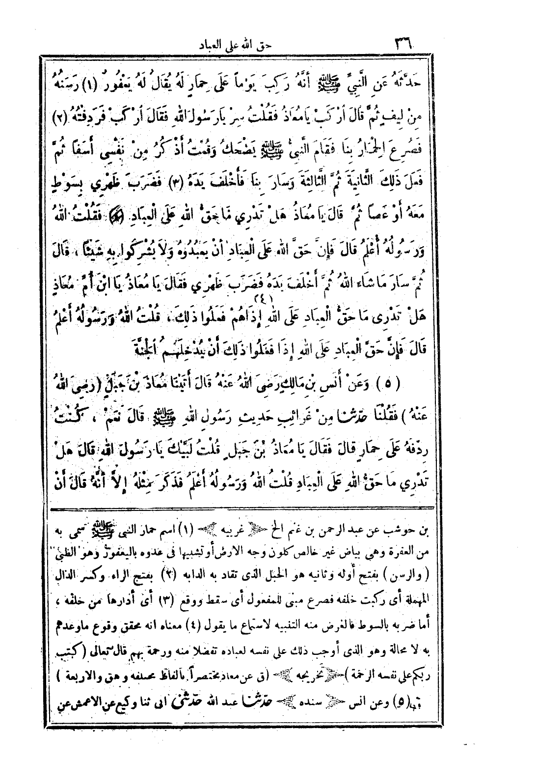 (5) (¬5) وعن أنس بن مالك رضي الله عنه قال أتينا معاذ بن جبل (رضي الله عنه) فقلنا حدثنا من غرائب حديث رسول الله صلى الله عليه وآله وسلم قال نعم، كنت رِدْفه على حمار قال فقال يا معاذ بن جبل قلت لبيك يا رسول الله، قال: هل تدري ما حق الله على العباد؟ قلت الله ورسوله أعلم، فذكر مثله إلاأنه قال أن