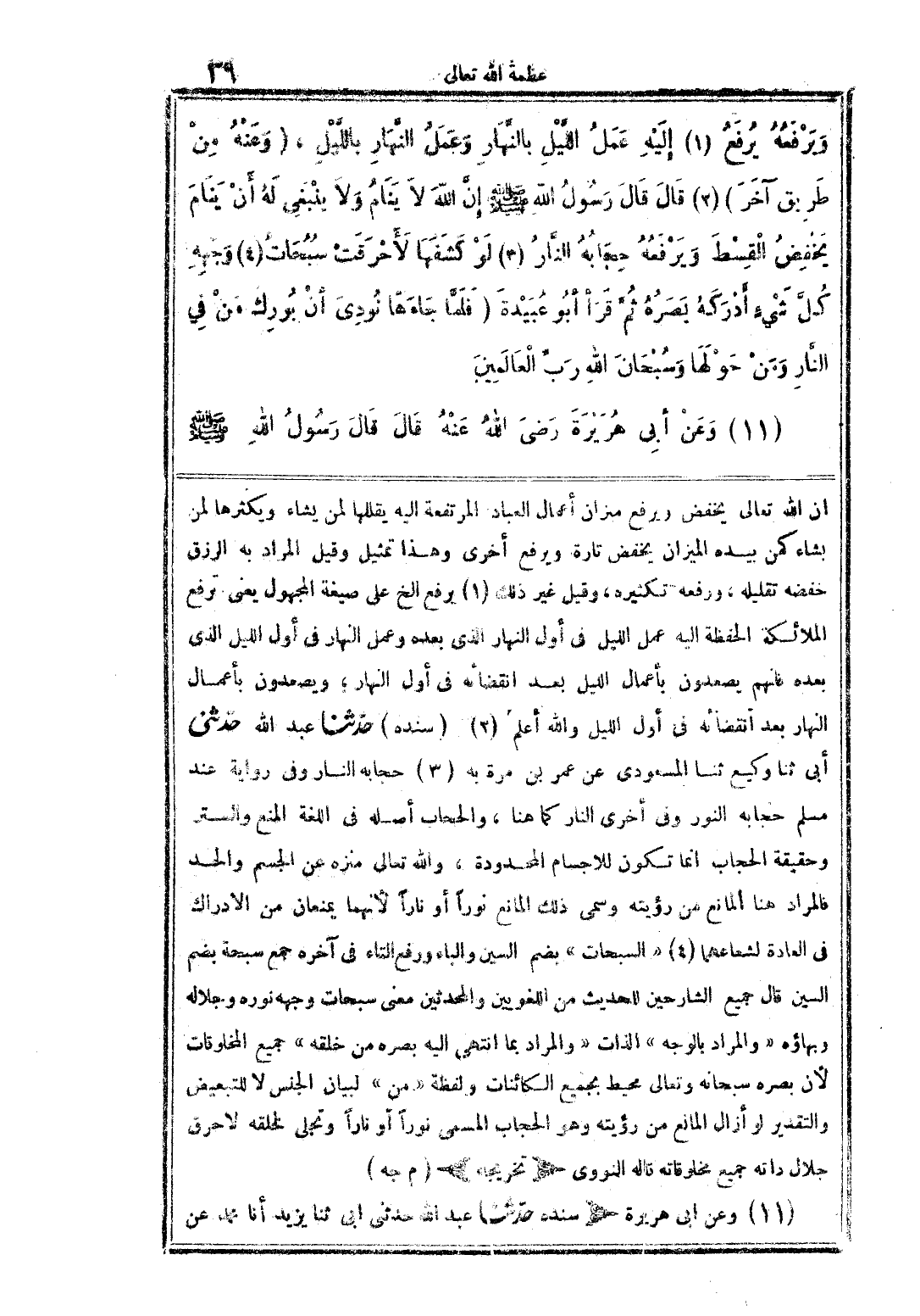 (¬4) "السبحات" بضم السين والباء ورفع التاء في آخره جمع سبحة بضم السين، قال جميع الشارحين للحديث من اللغويين والمحدثين معنى سبحات وجهه نوره وجلاله وبهاؤه، (والمراد بما انتهى إليه بصره من خلقه) جميع المخلوقات لأن بصره سبحانه وتعالى محيط بجميع الكائنات ولفظة (من) لبيان الجنس لا للتبعيض والتقدير أو أزال المانع من رؤيته وهو الحجاب المسمى نوراً أو ناراً ولو تجلى لخلقه لأحرق جلال ذاته جميع مخلوقاته قاله النووي (تخريجه) (م جه)