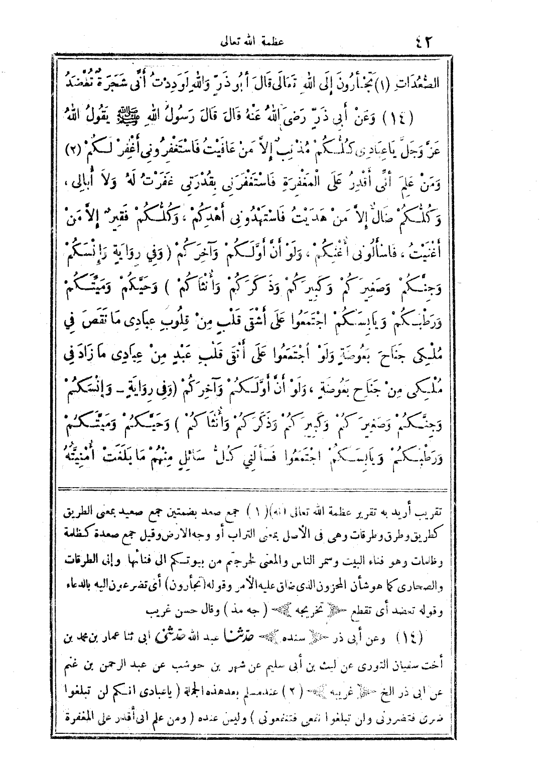الصعدات (1) تجأرون 'الي الله تعالي قال أبو ذر والله لوددت أني شجره تعضد (14) وعن ابي ذر رضل الله عنه قال قال رسول الله صلي الله عليه وسلم يقول الله عز وجل يا عبادي كلكم مذنب إلا من عافيت فاستغفروني أغفر لكم (2) ومن علم أني أقدر علي المغفرة فاستغفرني بقدرتي عفرت له ولا أبالي، وكلكم ضال إلا من هديت فاستهدوني اهدكم، وكلكم فقير الا من أغنيت،