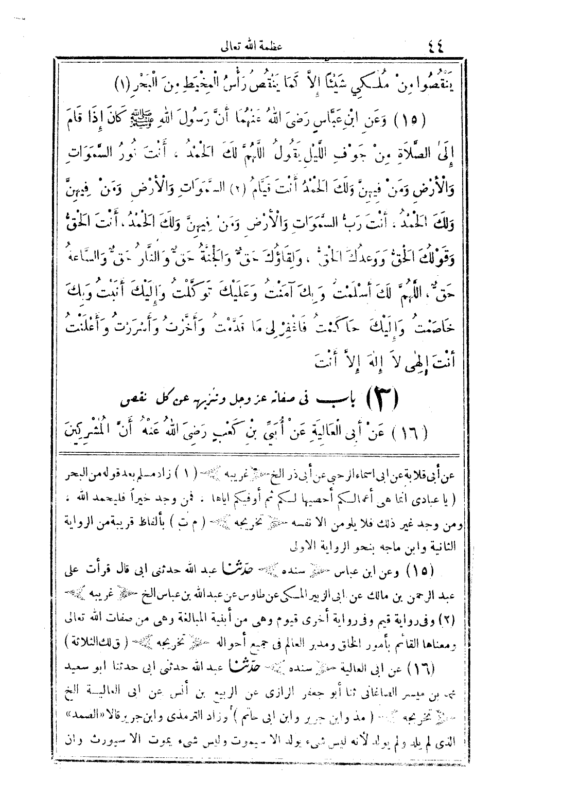 (15) وعن ابن عباس رضي الله عنهما أن رسول الله صلي الله عليه وسلم كان إذا قام إالي الصلاة من حوف الليل يقول اللهم لك الحمد، أنت نور السموات والأرض ومن فيهن ولك الحمد انت قيام (2) السموات والأرض ومن فيهن ولك الحمد: أنت رب السموات والأرض ومن فيهن ولك الحمد، أنت الحق وقولك الحق ووعدك الحق، ولقاؤك حق والجنة حق والنار حق والساعة حق، اللهم لك أسلمت وبك آمنت وعليك توكلت وإليك أنبت وبك خاصمت وإليك حاكمت فاغفر لي ما قدمت وأخرت وأسررت وأعلنت انت إلهي لا إله إلا أنت