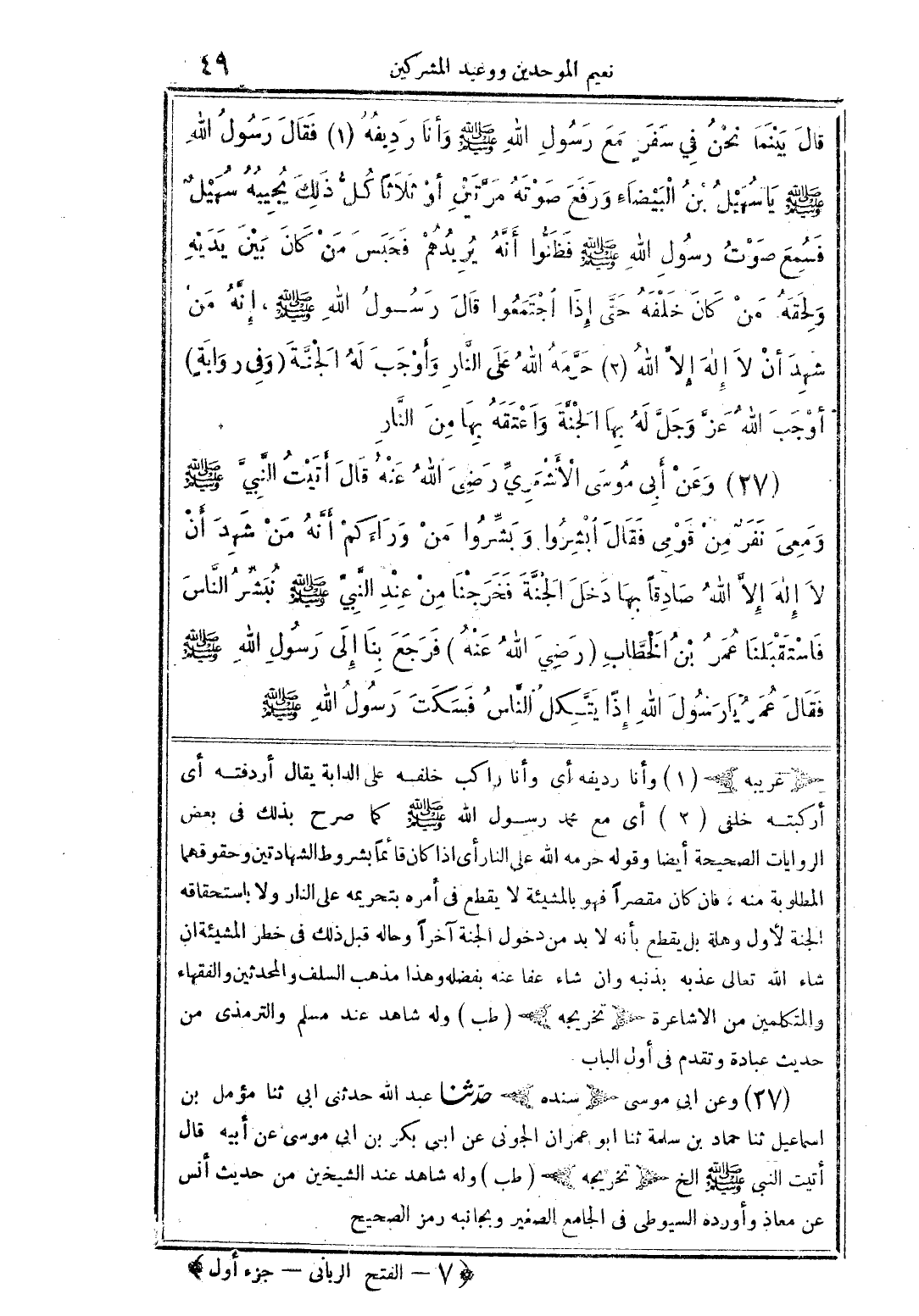 (27) وعن أبي موشي الأشعري رضي الله عنه قال أتيت النبي صلي الله عليه وسلم ومعي نفر من قومي فقال ابشروا وبشروا من وراءكم أنه من شهد أن لا إله إلا الله صادقاً بها دخل الجنة فخرجنا من عند النبي صلي الله عليه وسلم نبشر الناس فاستقبلنا عمر بن الخطاب (رضي الله عنه) فرجع بنا إلي رسول الله صلي الله عليه وسلم فقال عمر يا رسول الله إذاً يتكل الناس فسكت رسول الله صلى الله عليه وسلم