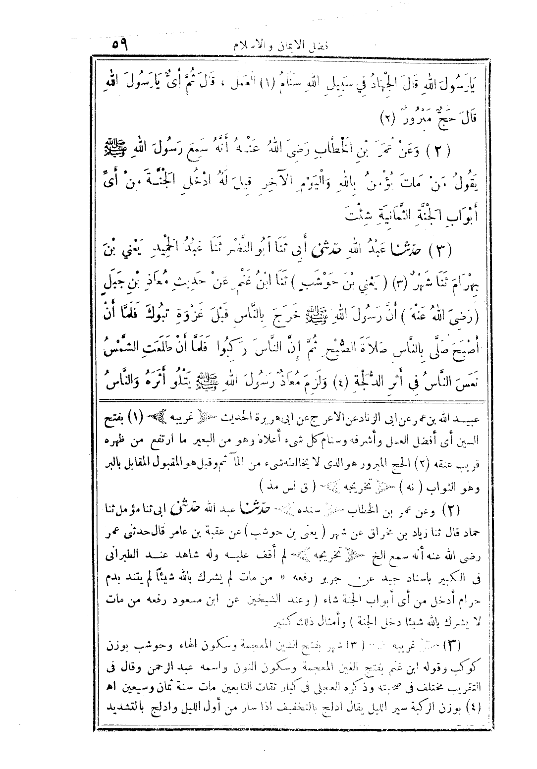 عبيد الله بن عمر عن ابى الزناد عن الاعرج عن ابى هريرة الحديث {غريبه} (1) بفتح السين أى أفضل العمل وأشرفه وسنام كل شئ اعلاه وهو من البعير ما ارتفع من ظهره قريب عنقه (2) الحج المبرور هو الذى لا يخالطه شئ من المآثم وقيل هو المقبول المقابل بالبر وهو الثواب (نه) {تخريجه} (ق نس مذ)