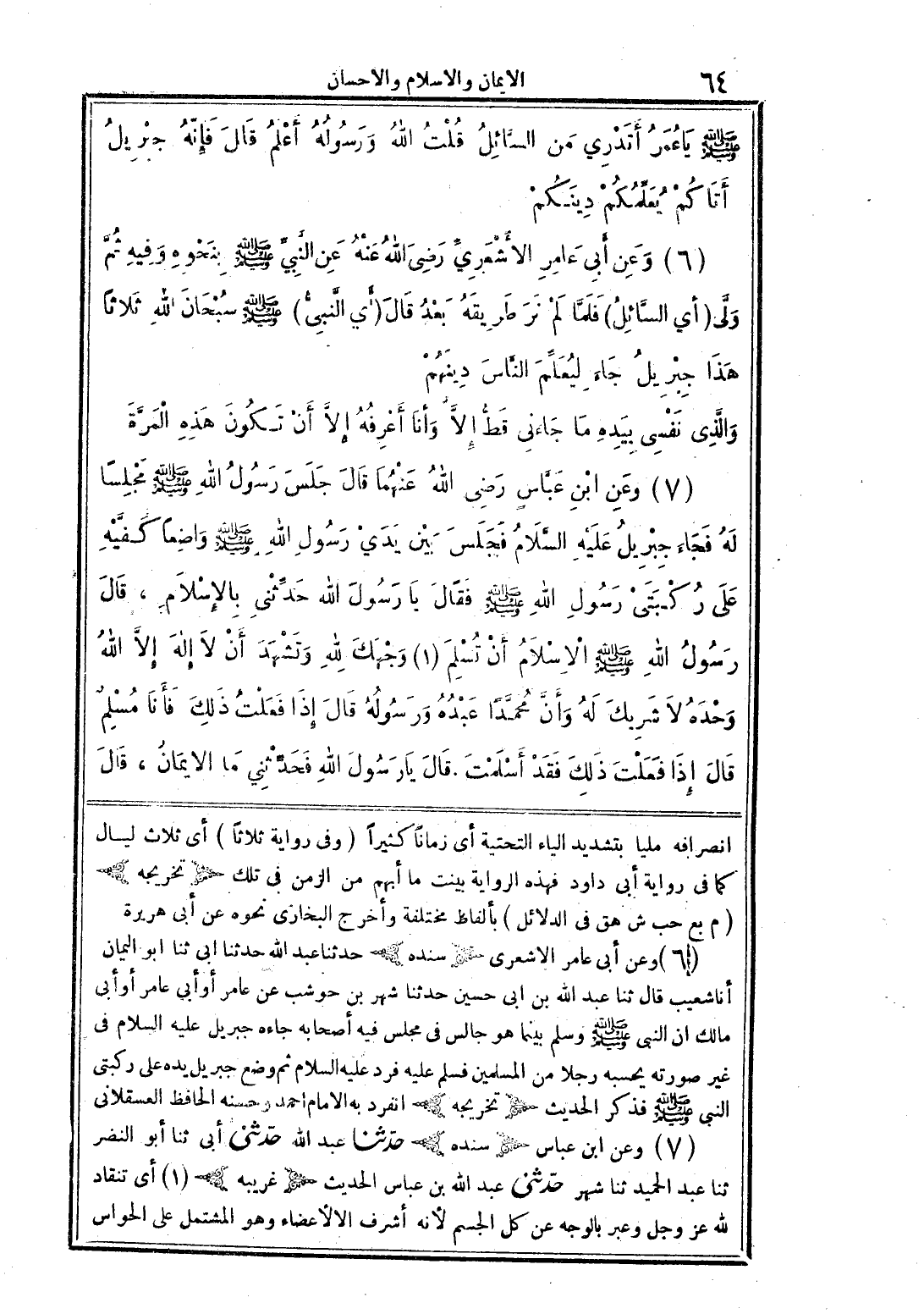 (6) (¬1) وعن أبي عامر الأشعري- رضي الله عنه- عن النبي- صلى الله عليه وآله وسلم - بنحوه وفيه ثم ولَّى (أي السائل) فلما لم نر طريقه بعد، قال (أي النبي) - صلى الله عليه وآله وسلم: سبحان الله ثلاثاً هذا جبريل جاء ليعلم الناس دينهم. والذي نفسي بيده ما جاءني قطٌ إلا وأنا أعرفه إلا أن تكون هذه المرة.