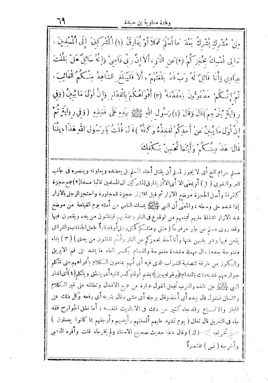 من مشرك يشرك بعدما أسلم عملاً أو يفارق (¬1) المشركين إلى المسلمين. مالي أمسك بحُجَزِكم (¬2) عن النار، ألا إن ربي داعِيَّ وإنه سائل هل بلغت عبادي، وأنا قائل له: رب قد بلغتهم، ألا فليبلغ الشاهد منكم الغائب، ثم إنكم مدعوون ومُفَدَّمةٌ (¬3) أفواهكم بالفِدام، وإن أول ما يبين (وفي رواية يترجم) قال: وقال (¬4) رسول الله- صلى الله عليه وآله وسلم - بيده على فخذه (وفي رواية ثم إن أول ما يبين عن أحدكم لفخذه وكفه) قال: قلت يا رسول الله هذا ديننا؟ قال: هذا دينكم وأينما تحسن يَكْفِكَ.