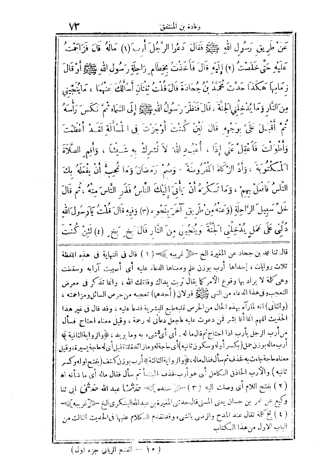 عن طريق رسول الله صلى الله عليه وسلم فقال دعوا الرجل أرب (1) ماله قال فزاحمت عليه حتى خلصت (2) اليه قال فأخذت بخطام راحلة رسول الله صلى الله عليه وسلم أو قال زمامها هكذا حدث محمد بن جحادة قال قلت ثنتان أسألك عنهما ما ينجيني من النار وما يدخلني الجنة قال فنظر رسول الله صلى الله عليه وسلم الى السماء ثم نكس رأسه ثم أقبل على بوجهه لئن كنت أوجزت في المسألة لقد أعظمت وأطولت فاعقل عني اذا اعبد الله لا تشرك به شيئا وأقم الصلاة المكتوبة وأد الزكاة المفروضة وصم رمضان وما تحب أن يفعله بك الناس فافعل بهم وما تكره أن يأتي اليك الناس فذر الناس منه ثم قال خل سبيل الراحلة (وعنه من طريقآخر بنحوه (3) وفيه قال قلت يا رسول الله دلني على عمل يدخلني الجنة وينجيني من النار قال بخ بخ (4) لئن كنت