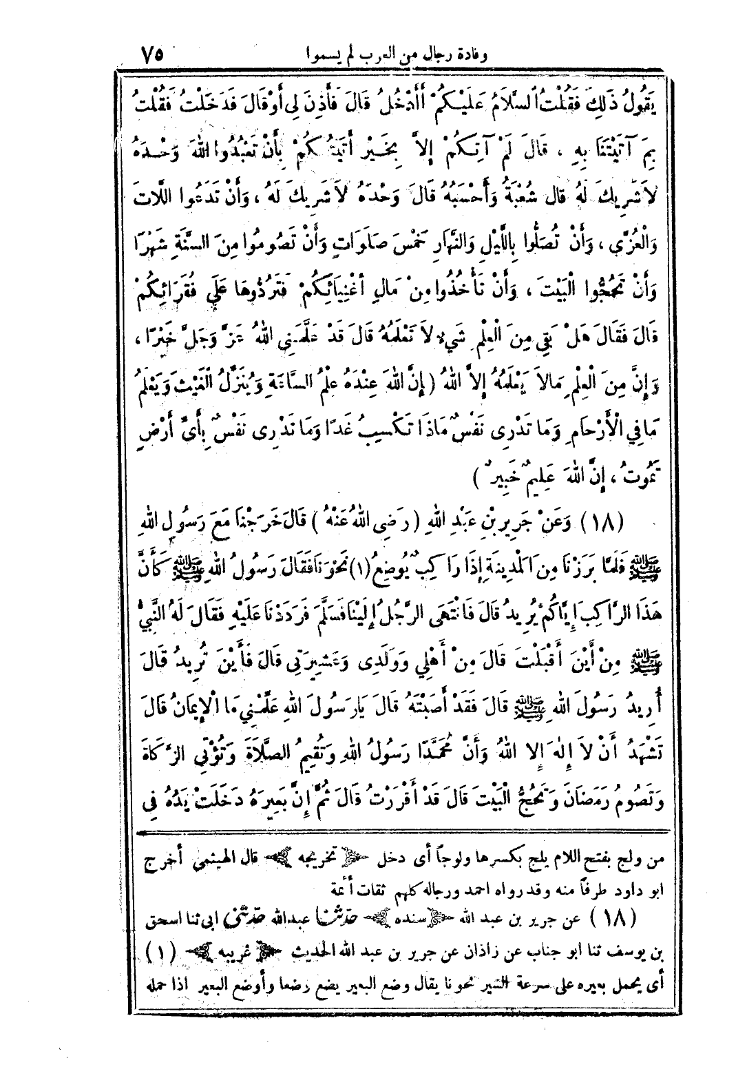 (18) وعن جرير بن عبد الله (رضى الله عنه) قال خرجنا مع رسول الله صلى الله عليه وسلم فلما برزنا من المدينة اذا راكب يوضع (1) نحونا فقال رسول الله صلى الله عليه وسلم كأن الراكب اياكم يريد قال فانتهى الرجل الينا فسلم فرددنا عليه فقال له النبى صلى الله عليه وسلم من أين أقبلت قال من أهلي وولدي وعشيرتي قال فأين تريد قال أريد رسول الله صلى الله عليه وسلم قال فقد أصبته قال يا رسول الله علمني ما الايمان قال تشهد أن لا اله الا الله وأن محمدا رسول الله وتقيم الصلاة وتؤتي الزكاة وتحج البيتقال قد أقررت قال ثم ان بعيره دخلت يده في