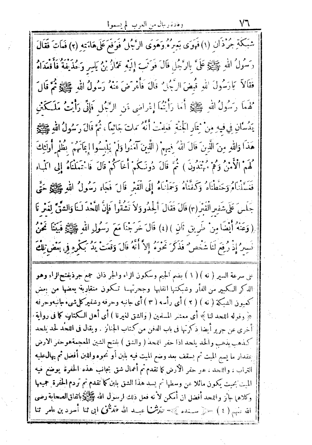 شبكة جرذان (1) فهوى بعيره وهوى الرجل فوقع على هامته (2) فمات فقال رسول الله صلى الله عليه وسلم على بالرجل قال فوثب اليه عمار بن ياسر وحذيفة فأقعداه فقالا يا رسول الله قبض الرجل قال فأعرض عنه رسول الله صلى الله عليه وسلم ثم قال لهما رسول الله صلى الله عليه وسلم أما رأيتما اعراضي عن الرجل فاني رأيت ملكين يدسان في فيه من ثمار الجنة فعلمت أنه مات جائعا ثم قال رسول الله صلى الله عليه وسلم هذا والله من الذين قال الله فيهم (الذيت آمنوا ولم يلبثوا ايمانهم بظلم أولئك لهم الأمن وهم مهتدون) ثم قال دونكم أخاكم قال فاحتملناه الى الماء فغسلناه وحنطناه وكفناه وحملناه الى القبر قال فجاء رسول الله صلى الله عليه وسلم حتى جلس على شفير القبر (3) قال فقال ألحد