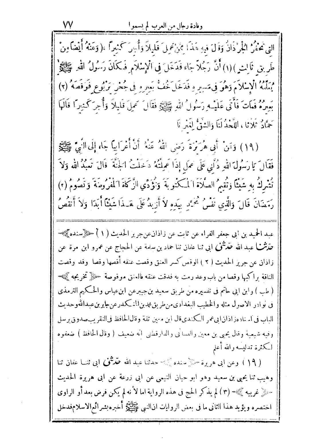 (19) وعن أبي هريرة (سنده) حدثنا عبد الله حدثني أبي ثنا عفان ثنا وهيب ثنا يحيى بن سعيد وهو ابن حبان التيمي عن ابي زرعة عن أبي هريرة الحديث (غريبة) (3) لم يذكر الحج في هذه الرواية لأنه لم يكن فرض بعد أو الراوى اختصره ويؤيد هذا الثاني ما في بعض الروايات أن النبى صلى الله عليه وسلم أخبره بشرائع الإسلام فدخل