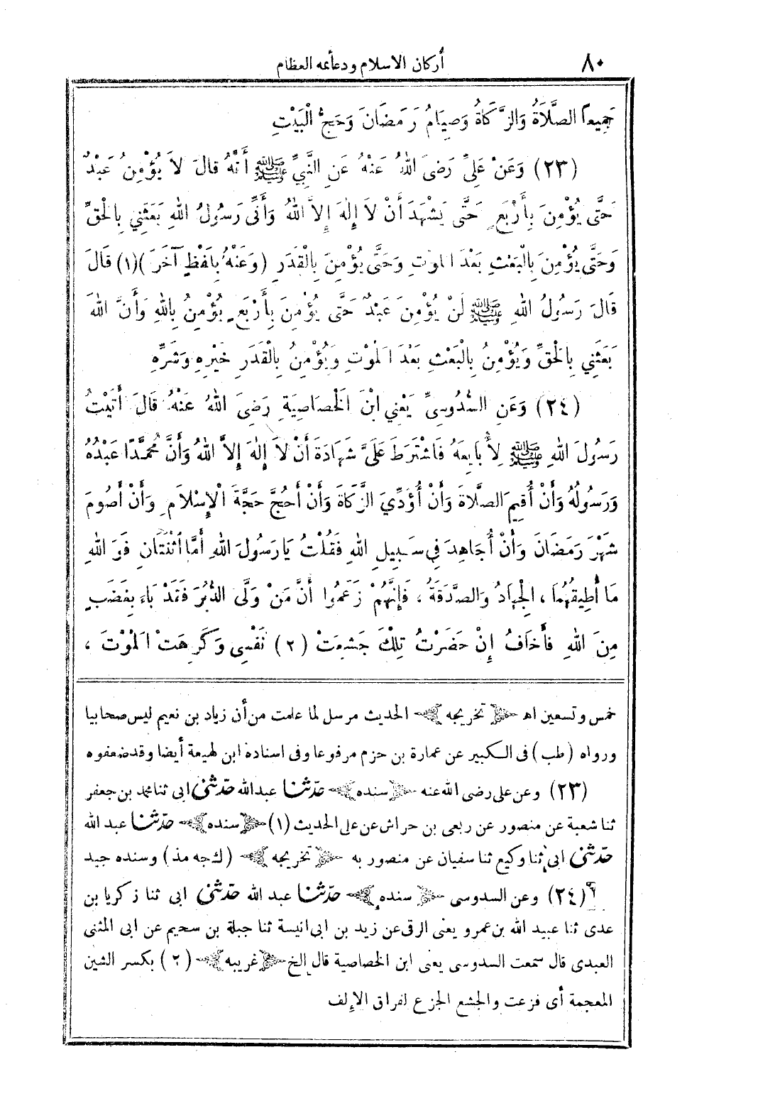 (23) وعن على رضى الله عنه عن النبى صلى الله عليه وسلم أنه قال لا يؤمن عبد حتى يؤمن بأربع حتى يشهد أن لا اله الا الله وأني رسول الله بعثني بالحق وحتى يؤمن بالبعث بعد الموت وحتى يؤمن بالقدجر (وعنه بلفظ آخر) (1) قال قال رسول الله صلى الله عليه وسلم لن يؤمن عبد حتى يؤمن بأربع يؤمن بالله وأن الله بعثني بالحق ويؤمن بالبعث بعد الموت ويؤمن بالقدر خيره وشره