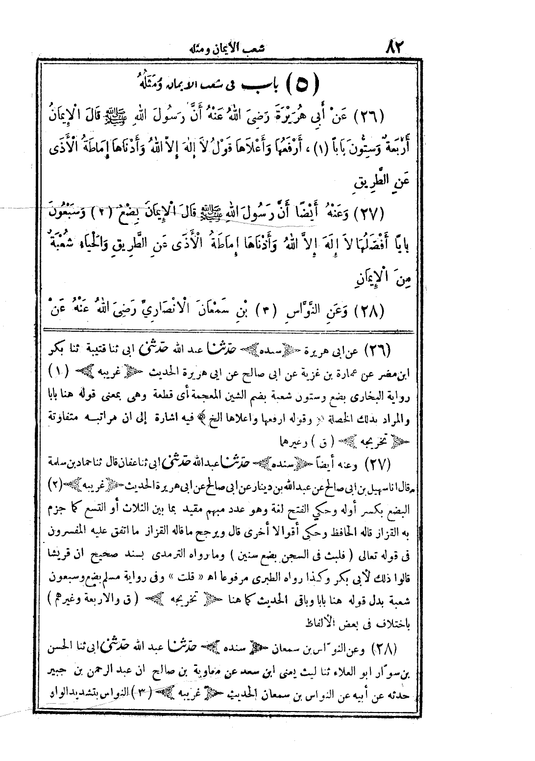 (26) عن أبي هريرة (سنده) حدثنا عبد الله حدثني أبي ثنا قتيبة ثنا بكر ابن مضر غن عمارة بن غزية عن أبي صالح عن أبي هريرة الحديث (غريبة) (1) رواية البخاري بضع وستون شعبة بضم الشين المعجمة وهى بمعنى قوله هنا بابا والمراد بذلك الخصلة (وقوله أرفعها وأعلاها الخ) فيه اشارة الى أن مراتبه متفاوتة (تخريجه) (ق) وغيرهما
