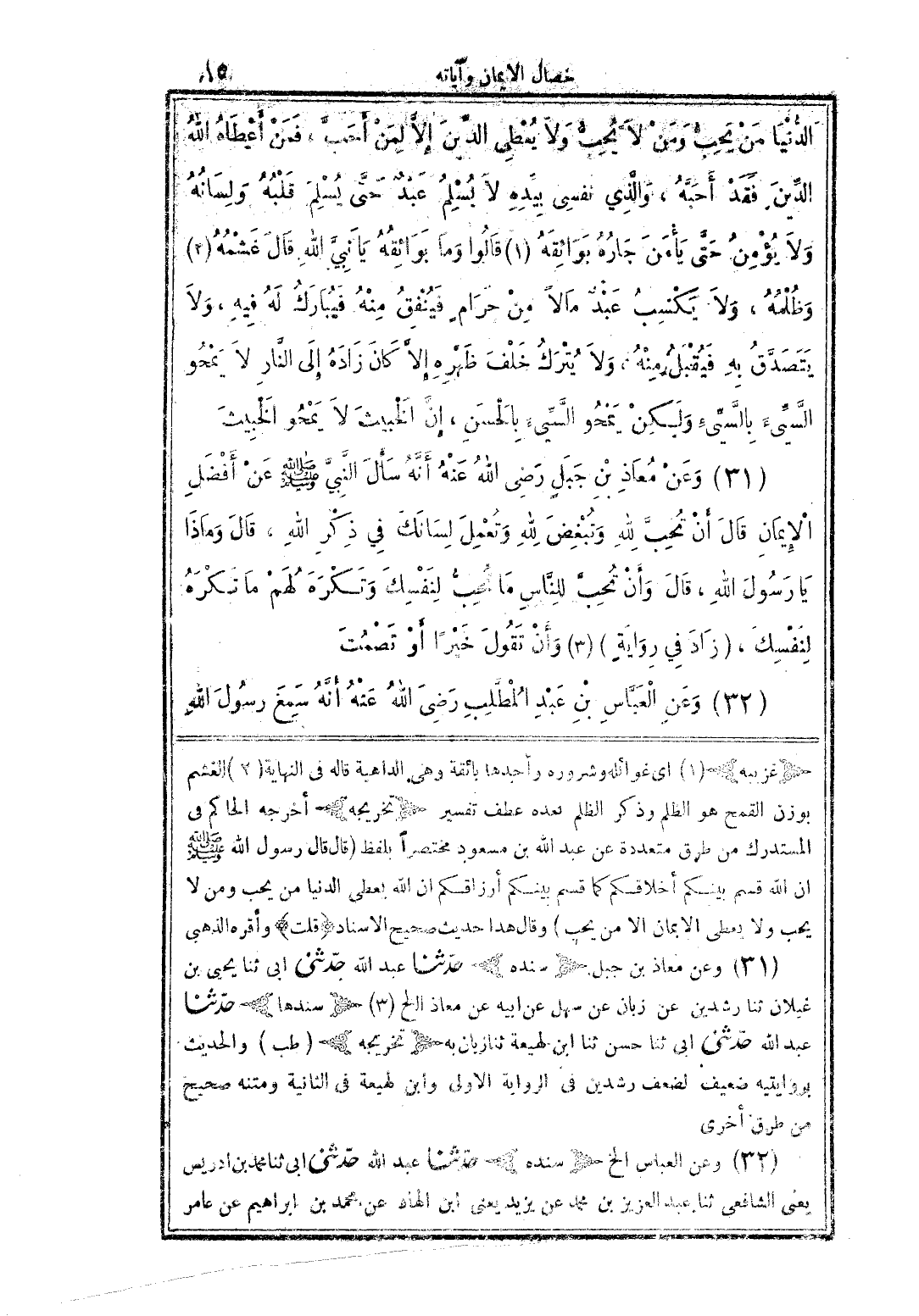 (31) وعن معاذ بن جبل رضى الله عنه أنه سأل النبى صلى الله عليه وسلم عن أفضل الايمان قال أن تحب لله وتبغض لله وتعمل لسانك في ذكر الله قال وماذا يا رسول الله قال وأن تحب للناس ما تحب لنفسك وتكره لهم ما تكره لنفسك (زاد في الرواية) (3) وأن تقول خيرا أو تصمت