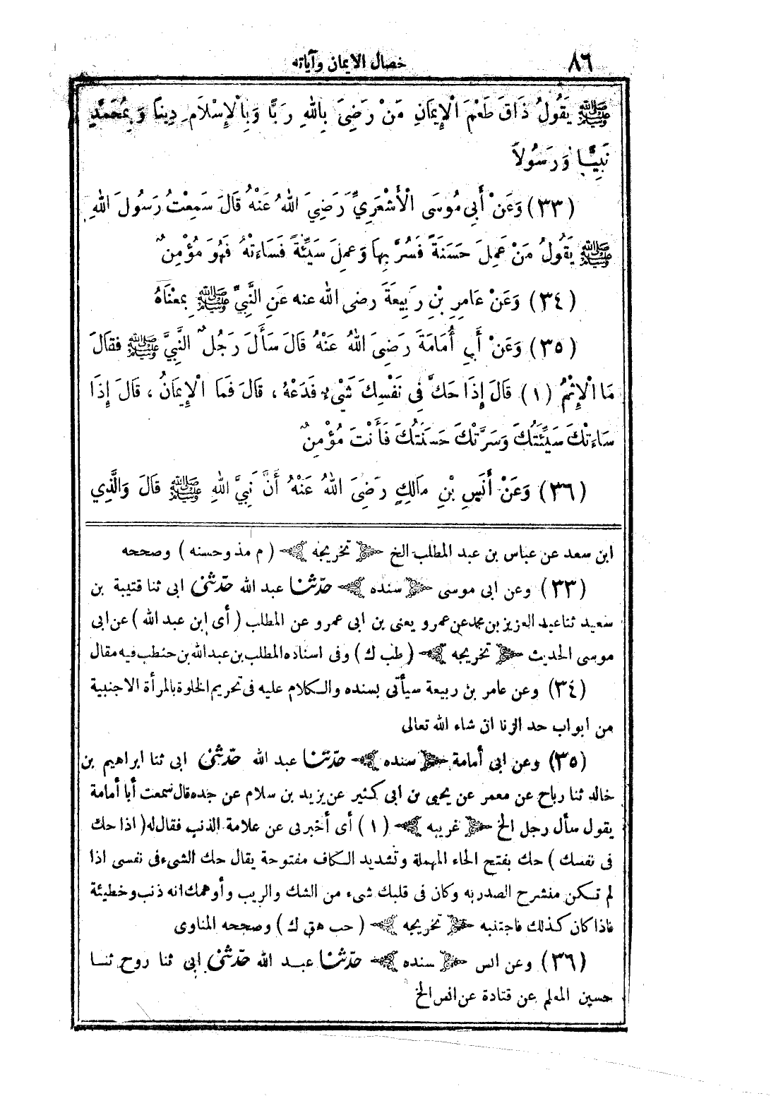 (35) وعن أبى أمامة رضى الله-قال سألأ رجل النبى صلى الله عليه وسلم فقال ما الأثم (1) قال اذا حك في نفسك شئ فدعه قال فما الايمان قال اذا ساءتك سيئتك وسرتك حسنتك فأنت مؤمن