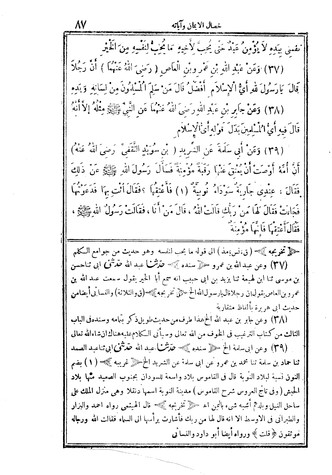 (37) وعن عبد الله بن عمرو بن العاص (رضى الله عنهما) أن رجلا قال يا رسول الله أى الاسلام أفضل قال من سلم المسلمون من لسانه ويده