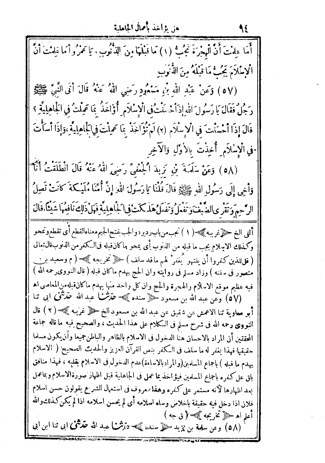 (57) وعن عبد الله بن مسعود رضى الله عنه قال أتى النبى صلى الله عليه وسلم رجل فقال يا رسول الله اذ أحسنت في الاسلام أؤاخذ بما عملت في الجاهلية؟ قال اذا أحسنت في الاسلام لم تؤاخذ بما عملت في الجاهلية واذا أسأت في الاسلام أخذت بالأول والآخر