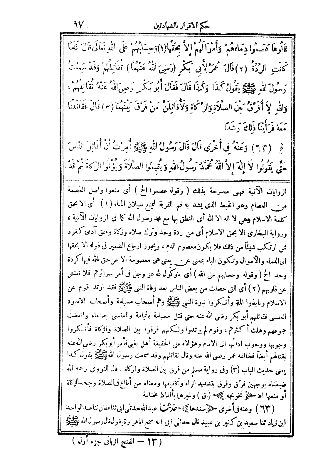 قالوها عصموا دمائهم وأموالهم الا بحقها (1) وحسابهم على الله تعالى فلما كانت الردة (2) قال عمر لأبي بكر (رضى الله عنهما) نقاتلهم وقد سمعت رسول الله صلى الله عليه وسلم يقول كذا وكذا قال فقال أبو بكر رضى الله عنه نقاتلهم والله لا أفرق بين الصلاة والزكاة ولأقاتلن من فرق بينهما (3) قال فقاتلنا معه فرأينا ذلك رشدا