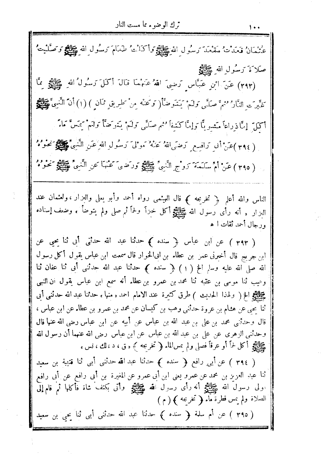 (393) عن ابن عبَّاس رضى الله عنهما قال أكل رسول الله صلى الله عليه وسلم ممَّا غَّيرت النَّار ثم صلَّى ولم يتوضَّأ (وعنه من طريق ثان) أنَّ النَّبيَّ صلى الله عليه وسلم أكل إمَّ ذراعًا مشويًا وإمَّا كتفًا ثم صلَّى ولم يتوضَّأ ولم يمسَّ ماء