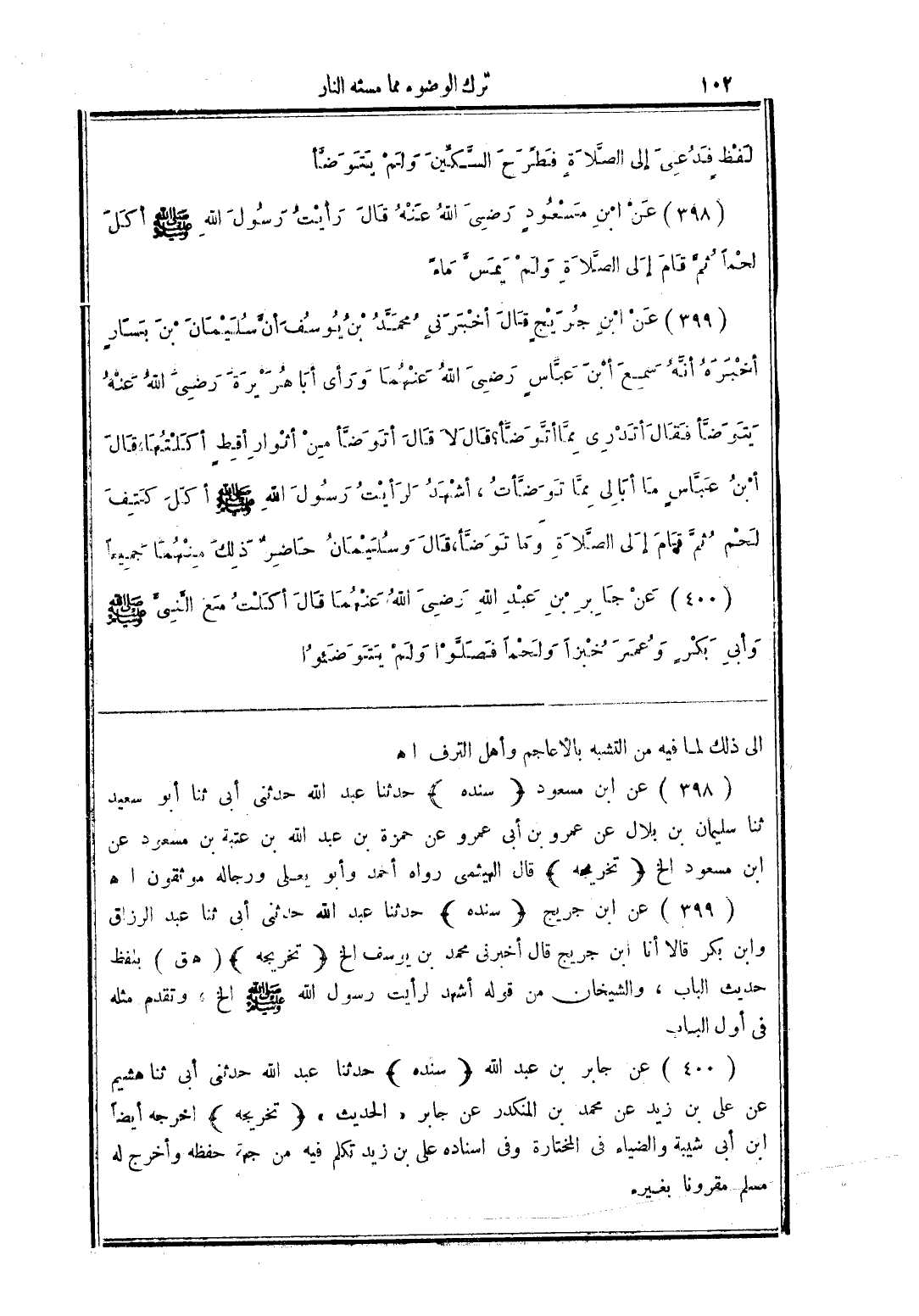 (398) عن ابن مسعود رضى الله عنه قال رأيت رسول الله صلى الله عليه وسلم أكل لحمًا ثمَّ قام إلى الصَّلاة ولم يمسَّ ماء