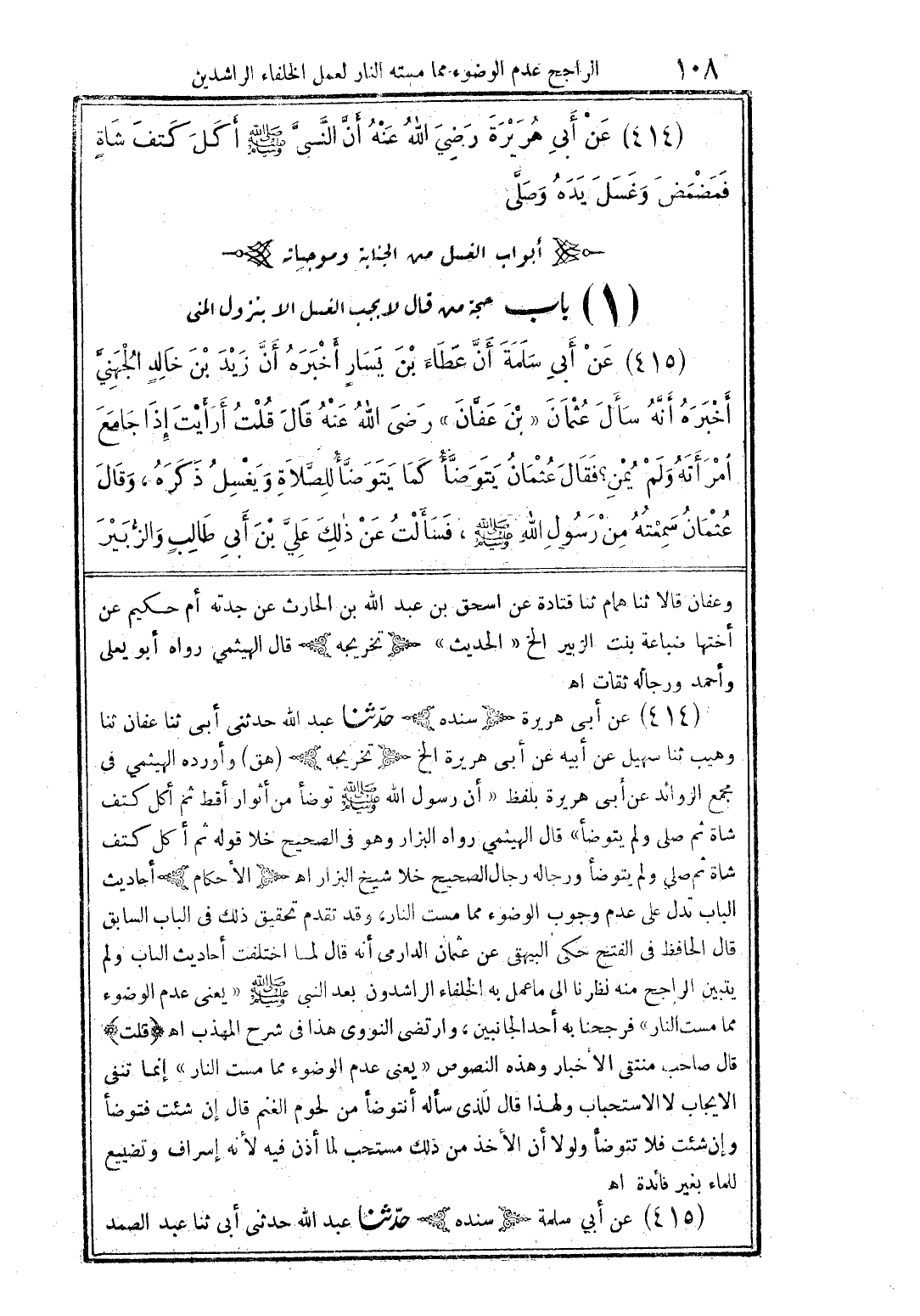 (414) عن أبي هريرة (سنده) حدّثنا عبد الله حدثني أبي ثنا عفان ثنا وهيب ثنا سهيل عن أبيه عن أبي هريرة الخ (تخريجه) (هق) وأورده الهيثمى في مجمع الزوائد عن أبي هريرة بلفظ (أن رسول الله صلى الله عليه وسلم توضأ من أثوار ثم أكل كتف شاة ثم صلى ولم يتوضأ) قال الهيثمى رواه البزار وهو في الصحيح خلا قوله ثم أكل كتف شاة ثم صلى ولم يتوضأ ورجاله رجال الصحيح خلا شيخ البزار اهـ (الأحكام) أحاديث الباب تدل على عدم وجوب الوضوء مما مست النار، وقد تقدم تحقيق ذلك في الباب السابق قال الحافظ في الفتح حكى البيهقى عن عثمان الدارمى أنه قال لما اختلفت أحاديث الباب لوم يتبين الراجح منه نظرنا الى ما عمل به الخلفاء الراشدين بعد النبي صلى الله عليه وسلم (يعنى عندم الوضوء مما مست النار) فرجحنا به أحد الجانبين، وارتضى النووي هذا في شرح المهذب اهـ (قلت)