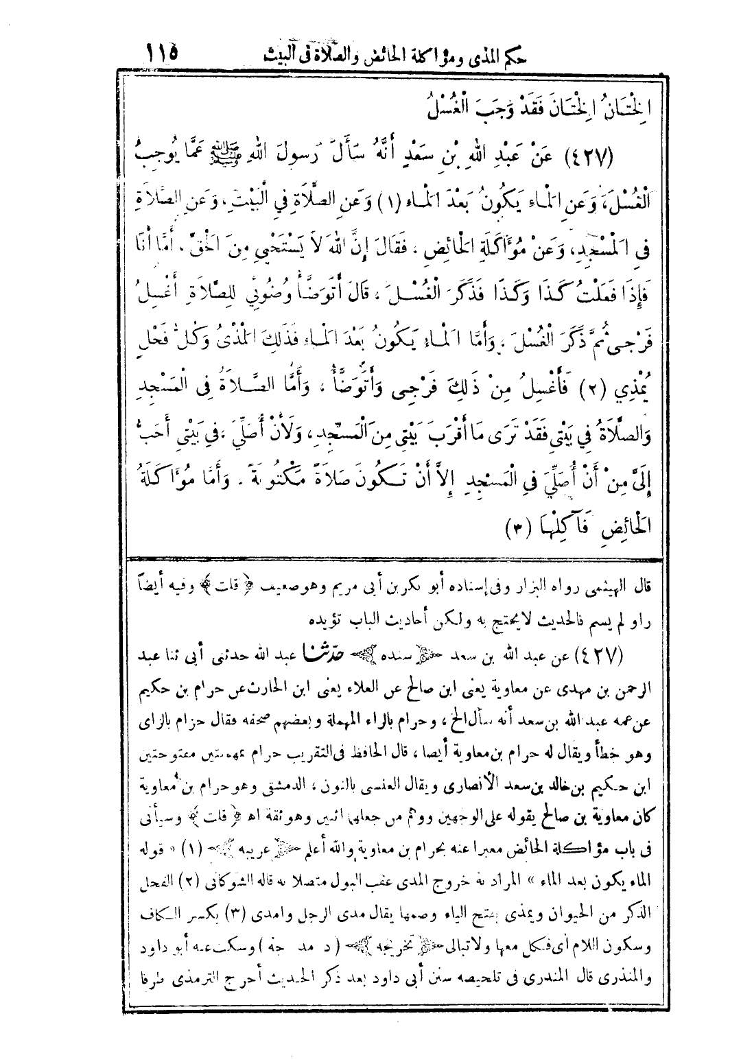 (427) عن عبد الله بن سعد أنَّه سأل رسول الله صلى الله عليه وسلم عمَّا يوجب الغسل، وعن الماء يكون بعد الماء وعن الصَّلاة فى البيت، وعن الصَّلاة فى المسجد، وعن مؤاكلة الحائض، فقال إنَّ الله لا يستحيى من الحقِّ، أمَّا أنا فإذا فعلت كذا وكذا فذكر الغسل، قال أتوضَّأ وضوئي للصَّلاة أغسل من ذلك فرجى وأتوضَّأ، وأمَّا الصَّلاة فى المسجد والصَّلاة في بيتى فقد ترى ما أقرب بيتى من المسّجد، ولأن أصلِّي، فى بيتى أحبُّ إلىَّ من أن أصلِّي في المسجد إلاَّ أن تكون صلاةً مكتوبةً. وأمَّ مؤاكلة الحائض فآكلها