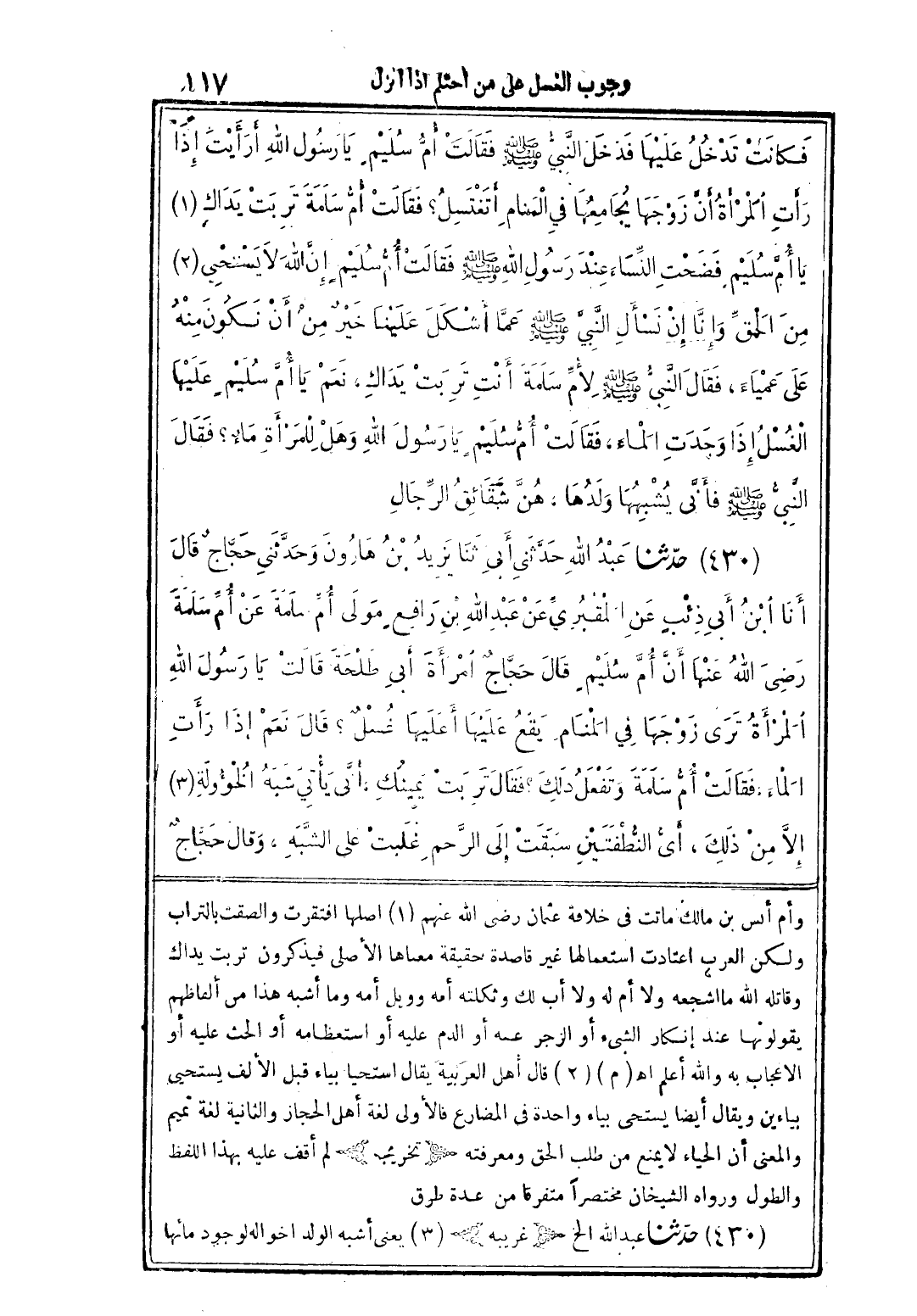 فكانت تدخل عليها فدخل النَّبيُّ صلى الله عليه وسلم فقالت أمُّ سليم يا رسول الله أرأيت إذا رأت المرأة أنَّ زوجها يجامعها في المنام أتغتسل؟ فقالت أمُّ سلمة تربت يداك يا أمَّ سليم فضحت النِّساء عند رسول الله صلى الله عليه وسلم فقالت أمُّ سليم إنَّ الله لا يستحيى من الحقَّ وإنَّ إن نسأل النَّبيَّ صلى الله عليه وسلم عمَّا أشكل علينا خير من أن نكون منه على عمياء، فقال النَّبيُّ صلى الله عليه وسلم لأمِّ سلمة أنت تربت يداك، نعم يا أمَّ سليم عليها الغسل إذا وجدت الماء، فقالت أمُّ سليم يا رسول الله وهل للمرأة ماء؟ فقال النَّبيُّ صلى الله عليه وسلم فأنَّى يشبهها ولدها، هنَّ شقائق الرِّجال