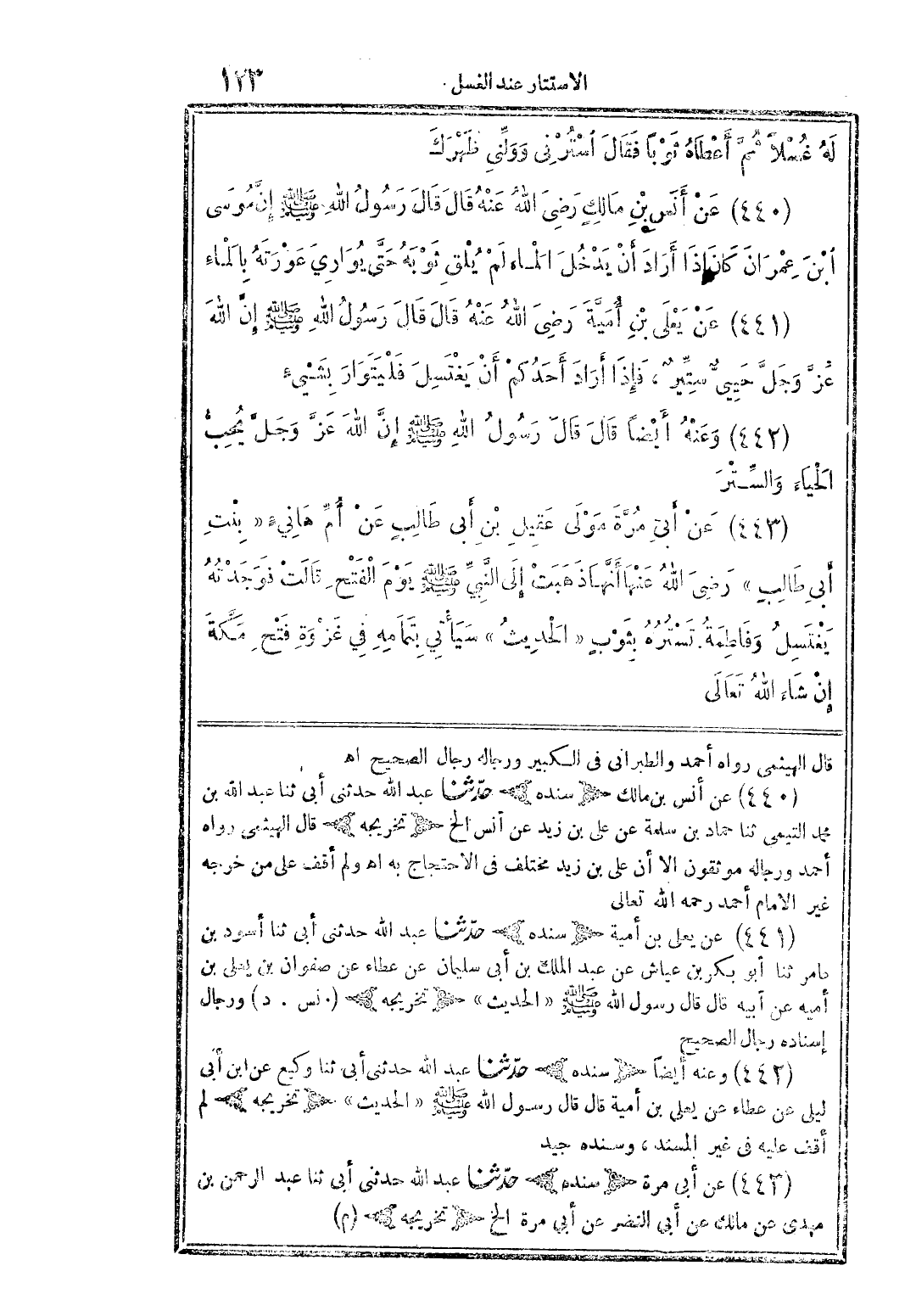 (441) عن يعلى بن أميَّة رضى الله عنه قال قال رسول الله صلى الله عليه وسلم إنَّ الله عزَّ وجلَّ حييٌّ ستِّر، فإذا أراد أحدكم أن يغتسل فليتوار بشيء
