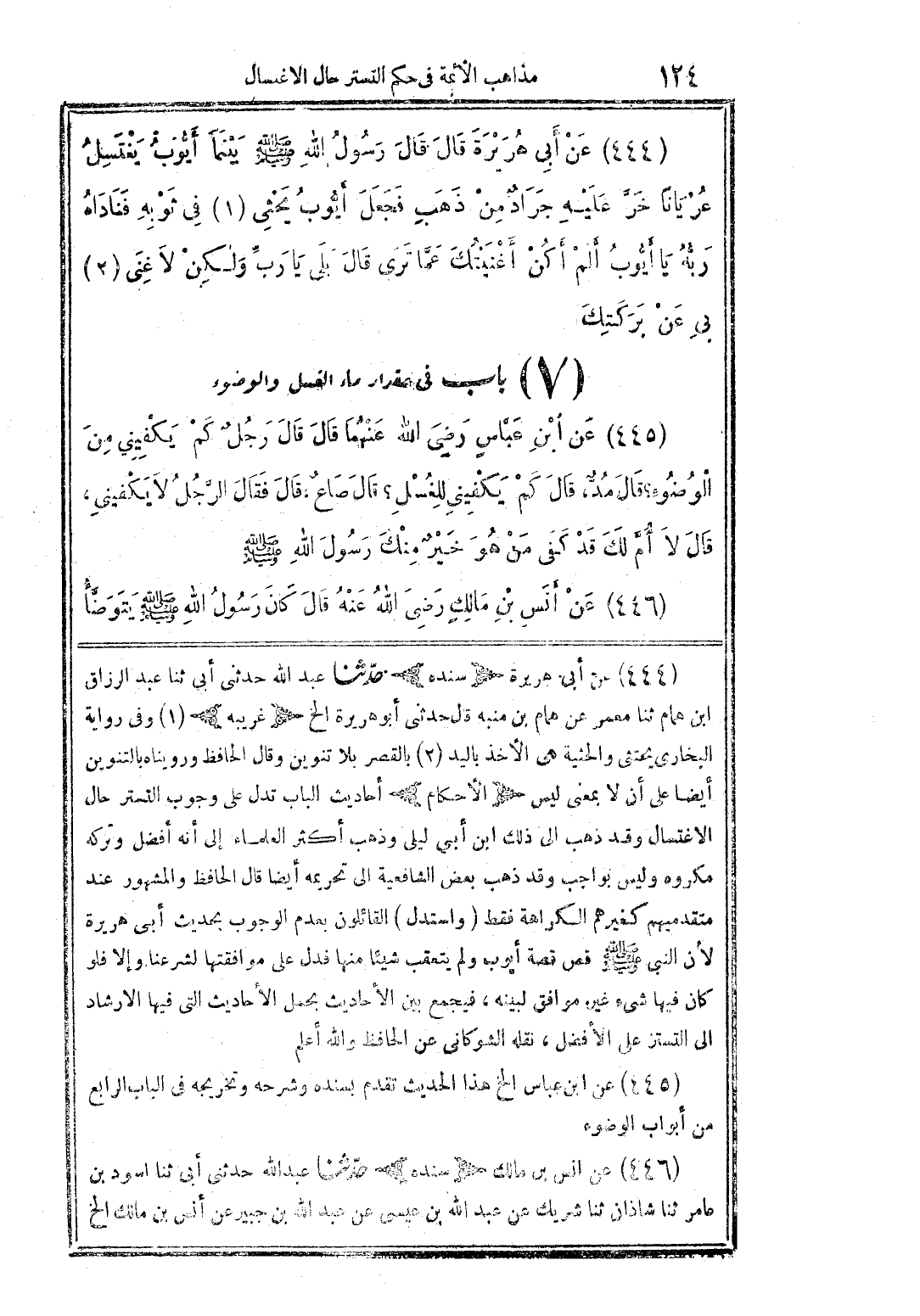 (444) عن أبي هريرة (سنده) حدّثنا عبد الله حدثني أبي ثنا عبد الرزاق ابن همام ثنا معمر عن همام بن منبه قال حدثني أبو هريرة الخ (غريبه) (1) وفي رواية البخاري يحتثى والحنية هي الأخذ باليد (2) بالقصر بلا تنوين وقال الحافظ ورويناه بالتنوين أيضا على أن لا بمعنى ليس (الأحكام) أحاديث الباب تدل على وجوب التستر جال الاغتسال وقد ذهب إلى ذلك ابن أبي ليلي وذهب أكثر العلماء إلى انه أفضل وتركه مكروه وليس بواجب وقد ذهب بعض الشافعية إلى تحريمه أيضا قال الحافظ والمشهور عند متقدميهم كغيرهم الكراهة فقط (واستدل) القائلون بعدم الوجوب بحديث أبي هريرة لأن النبي صلى الله عليه وسلم قص قصة أيوب ولو يتعب شيئا منها فدل على موافقتها لشرعنا وإلا فلو كان فيها شيء غيره موافق لبينه، فيجمع بين الأحاديث بحمل الأحاديث التي فيها الارشاد إلى التستر على الأفضل، نقله الشوكاني عن الحافظ والله أعلم