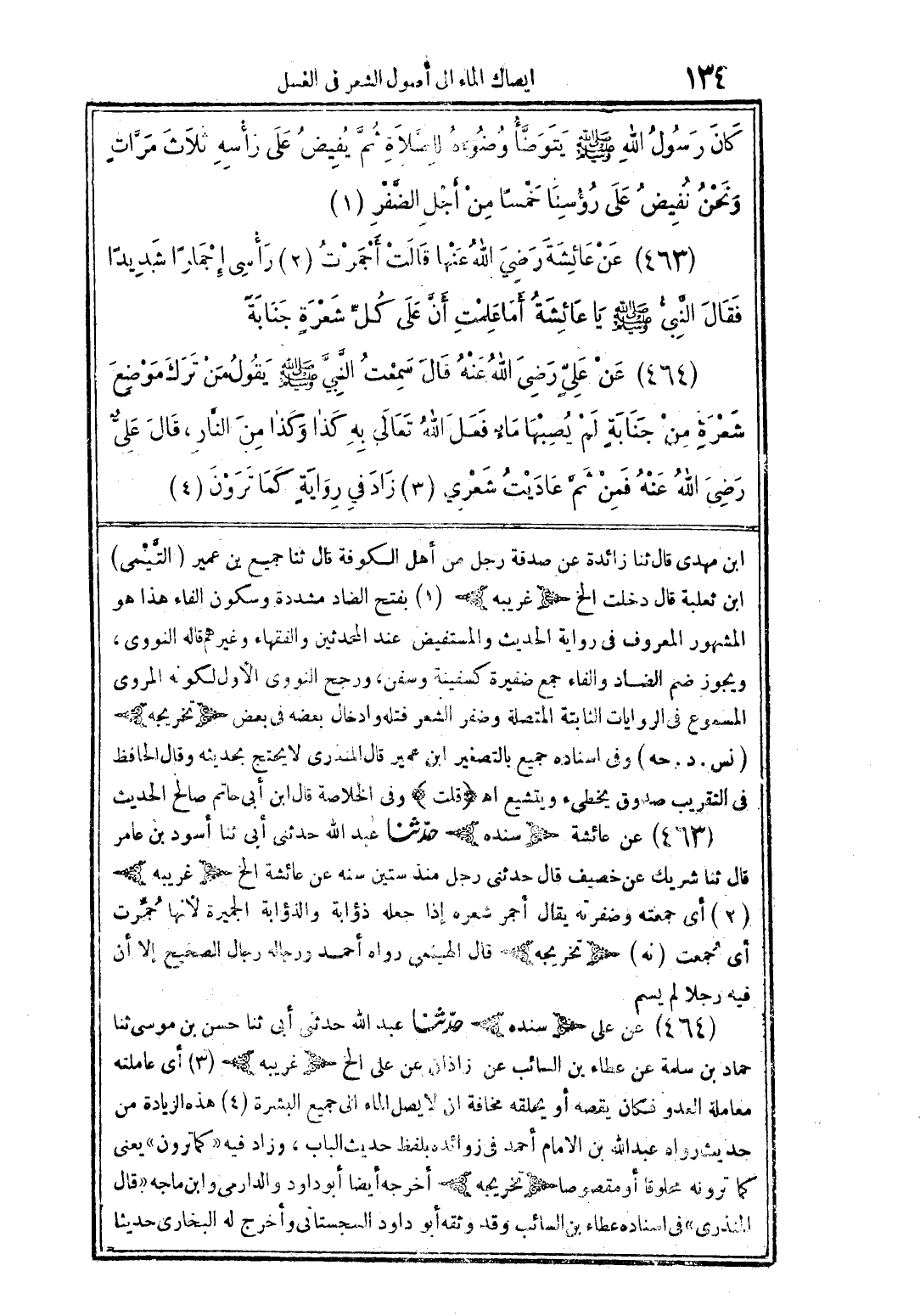 (464) عن علىّ رضى الله عنه قال سمعت النَّبيَّ صلى الله عليه وسلم يقول من ترك موضع شعرة من جنابة لم يصبها ماء فعل الله تعالى به كذا وكذا من النَّار، قال علىُّ رضى الله عنه فمن ثمَّ عاديت شعري زاد في رواية كما ترون