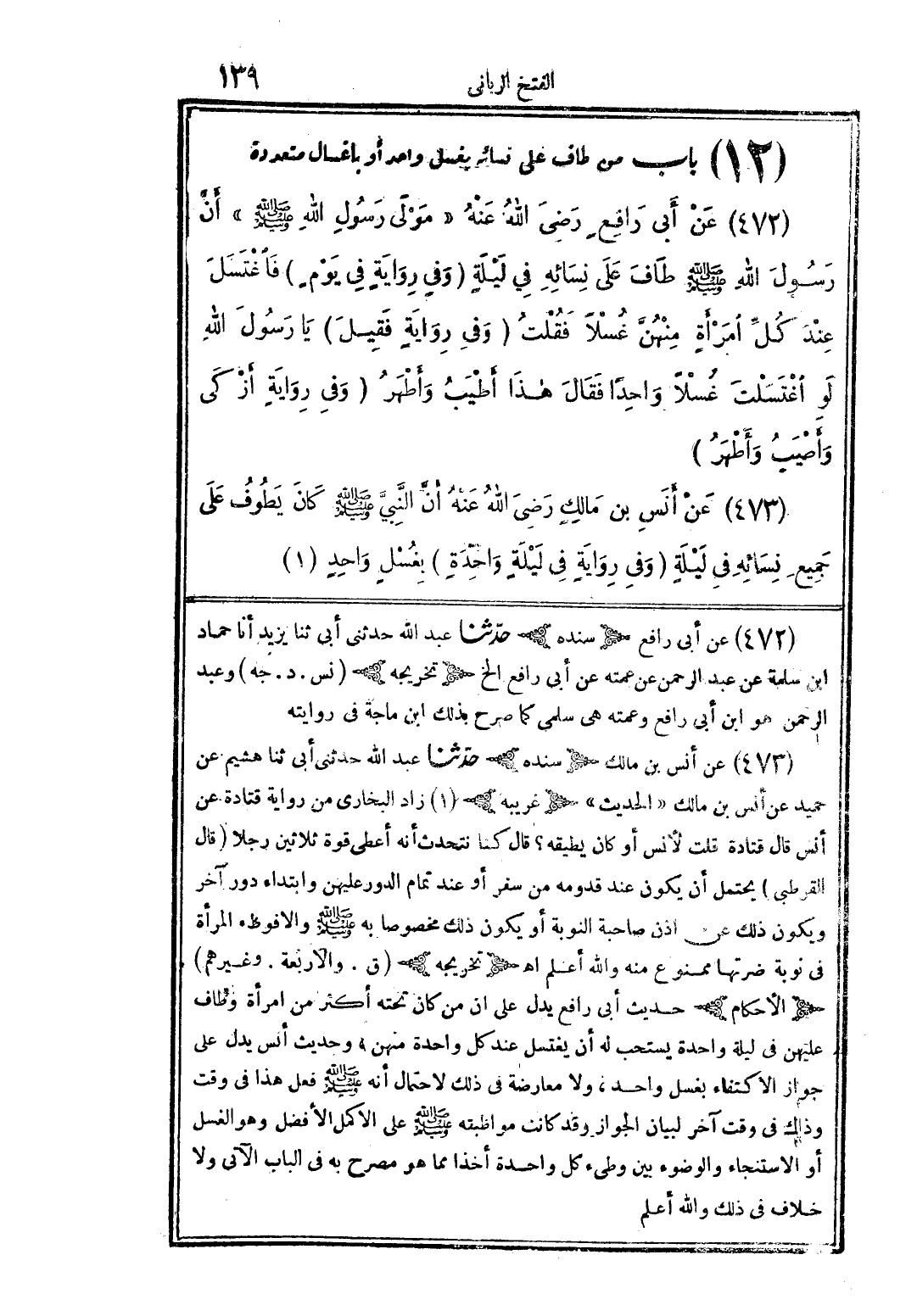 (473) عن أنس بن مالك رضى الله عنه أنَّ النَّبيَّ صلى الله عليه وسلم كان يطوف على جميع نسائه فى ليلة (وفى رواية فى ليلة واحدة) بغسل واحد