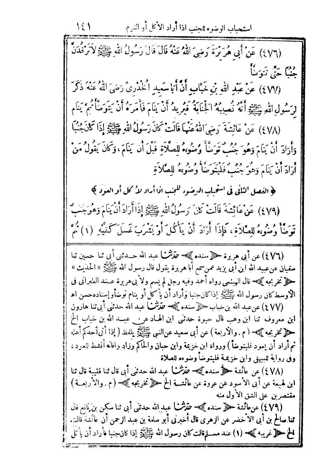 (477) عن عبد الله بن خبَّاب أنَّ أبا سعيد الخدرىِّ رضى الله عنه ذكر لرسول الله صلى الله عليه وسلم أنَّه تصيبه الجنابة فيريد أن ينام فأمره أن يتوضَّأ ثمَّ ينام