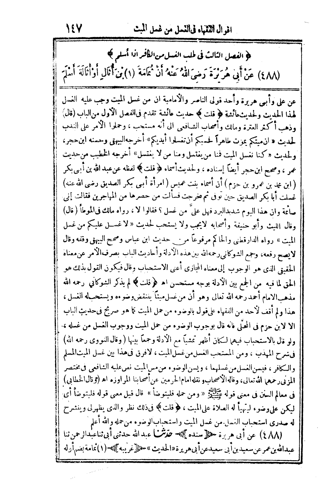 عن علي وأبي هريرة وأحد قولي الناصر والأمامية أن من غسل الميت وجب عليه الغسل لهذا الحديث ولحديث عائشة (قلت) حديث عائشة تقدم في الفصل الأول من الباب (قال) وذهب أكثر العترة ومالك وأصحاب الشافعي إلى أنه مستحب، وحملوا الأمر على الندب لحديث "أن ميتكم طاهرًا فحسبكم أن تغسلوا أيديكم" أخرجه البيهقي وحسنه ابن حجر، ولحديث "كنا نغسل الميت فمنا من يغتسل ومنا من لا يغتسل" أخرجه الخطيب من حديث عمر، وصحح ابن حجر أيضًا إسناده، ولحديث أسماء (قلت) لفظه عن عبد الله بن أبي بكر (ابن محمد بن عمرو بن حزم) أن أسماء بنت عميس (امرأة أبي بكر الصديق رضي الله عنه) غسلت أبا بكر الصديق حين توفي ثم خرجت فسألت من حصرها من المهاجرين فقالت إني صائمة وإن هذا اليوم شديد البرد فهل علىَّ من غسل؟ فقالوا لا، رواه مالك في الموطأ (قال) وقال الليث وأبو حنيفة وأصحابه لا يجب ولا يستحب لحديث "لا غسل عليكم من غسل الميت" رواه الدارقطني والحاكم مرفوعًا من حديث ابن عباس وصحح البيهقي وفقه وقال لا يصح رفعه، وجمع الشوكاني رحمه الله بين هذه الأدلة وأحاديث الباب بصرف الأمر عن معناه الحقيقي الذي هو الوجوب إلى معناه المجازي أعنى الاستحباب وقال فيكون القول بذلك هو الحق لما فيه من الجمع بين الأدلة بوجه مستحسن اه (قلت) لم يذكر الشوكاني رحمه الله مذهب الإمام أحمد رحمه الله تعالى وهو أن من غسل ميتًا ينتقض وضوءه ويستحب له الغسل، هذا ولم أقف لأحد من الفقهاء على قول بالوضوء من حمل الميت كما هو صريح في حديث الباب إلا لابن حزم في المحلي فإنه قال بوجوب الوضوء من حمل الميت ووجوب الغسل من غسله، ولو قال بالاستحباب فيهما لكان أظهر تمشيًا مع الأدلة وجمعًا بينها (وقال النووي رحمه الله) في شرح المهذب، ومن المستحب الغسل من غسل الميت، لا فرق في هذا بين غسل الميت المسلم والكافر، فيسن الغسل من غسلهما، ويسن الوضوء من مس الميت نص عليه الشافعي في مختصر المزني رحمها الله تعالى، وقاله الأصحاب ونقله أمام الحرمين عن أصحابنا المراوزه اه (وقال الخطابي) في معالم السنن في معنى قوله صلى الله عليه وسلم "ومن حمله فليتوضأ" قال قيل معي قوله فليتوضأ أي ليكن على وضوء ليهيأ له الصلاة على الميت، (قلت) في ذلك نظر والذي يظهر لي وينشرح له صدري استحباب الغسل من غسل الميت واستحباب الوضوء من حمله والله أعلم.