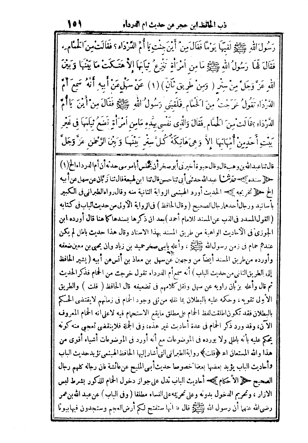 رسول الله صلى الله عليه وسلم لقيها يومًا فقال من أين جئت يا أمَّ الدِّرداء؟ فقالت من الحمَّام، فقال لها رسول الله صلى الله عليه وسلم ما من امرأة تنزع ثيابها إلَّا هتكت ما بينها وبين الله عزَّ وجل من ستر (ومن طريق ثان) عن سهل عن أبيه أنَّه سمع أمّ الدرداء تقول خرجت من الحمَّام فلقينى رسول الله صلى الله عليه وسلم فقال من أين يا أمَّ الدَّردتء؟ قالت من الحمَّام فقال والَّذى نفسى بيده ما من امرأة تضغ ثيابها فى بيت أحد من أمَّهاتها إلاَّ وها هاتكة كلَّ ستر بينها وبين الرَّحمن عزَّ وجلَّ