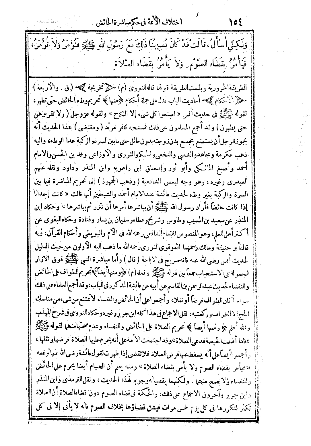 الطريقة الحرورية وبئست الطريقة قولها قال النووي (م) (تخريجه) (ق. والأربعة) (الأحكام) أحاديث الباب تدل على جملة أحكام (منها) تحريم وطء الحائض حتى تطهر، قوله صلى الله عليه وسلم في حديث أنس "اصنعوا كل شيء إلا النكاح" ولقوله عز وجل (ولا تقربوهن حتى يطهرن) وقد أجمع المسلون عى ذلك فمستحله كافر مرتد (ومقتضى) هذا الحديث أنه يجوز للرجل أن يستمتع بجميع بدن زوجته بدون حائل حتى ما بين السرة والركبة عدا الوطء، وإليه ذهب عكرمة ومجاهدو الشعبي والنخعي والحكم والثوري والأوزاعي ومحمد بن الحسن والامام أحمد وأصبغ المالكي وأبو ثور وإسحاق ابن راهويه وابن المنذر وداود ونقله عنهم العبدري وغيره، وهو وجه لبعض الشافعية (وذهب الجمهور) إلى تحريم المباشرة فيما بين السرة والركبة بغير وطء لحديث عائشة عند الامام أحمد والشيخين أنها قالت "كانت إحدانا إذا كانت حائضًا فأراد رسول الله صلى الله عليه وسلم أن يباشرها أمرها أن تتزر ثم يباشرها" وحكاه ابن المنذر عن سعيد بن المسيب وطاوس وشريح وعطاء وسليمان بن يسار وقتادة وحكاه البغوي عن أكثر أهل العلم، وهو المنصوص للامام الشافعي رحمه الله في الأم والبويطي وأحكام القرآن، وبه قال أبو حنيفة ومالك رحمهما الله وقوى النووي رحمه الله ما ذهب إليه الأولون من حيثالدليل لحديث أنس رضي الله عنه فإنه صريح في الإباحة (قال) وأما مباشرة النبي صلى الله عليه وسلم فوق الأزار فمحمولة على الاستحباب جمعًا بين قوله صلى الله عليه وسلم وفعله (م) (ومنها أيضًا) تحريم الطواف على الحائض والنفساء لحديث عبد الرحمن بن القاسم عن أبيه عن عائشة المذكور في الباب، وقد أجمع العلماء على ذلك سواء أكان الطواف فرضًا أو نقلًا، وأجمعوا على أن الحائض والنفساء لا تمتنع من شيء من مناسك الحج إلا الطواف وركعتيه، نقل الاجماع في هذا كله ابن جرير وغيره وحكاه النووي في شرح المهذب والله أعلم (ومنها أيضًا) تحريم الصلاة على الحائض والنفساء وعدم صحتها منهما لقوله صلى الله عليه وسلم "فإذا أقبلت الحيضة فدعي الصلاة" وقد اجتمعت الأمة على أنه يحرم عليها الصلاة فرضها ونقلها" وأجمعوا أيضًا على أن يسقط عنها فرض الصلاة فلا تقضي إذا طهرت لقول عائشة رضي الله عنها ترفعه فأمر بقضاء الصوم ولا يأمر بقضاء الصلاة" ومنه يعلم أن الصيام أيضًا يحرم على الحائض والنفساء ولا يصح منهما. ولكنهما يقضيانه وجوبًا لهذا الحديث، ونقل الترمذي وابن المنذر وابن جرير وآخرون الاجماع على ذلك، والحكمة في قضاء الصوم دون قضاء الصلاة أنا لصلاة تكثر لتكررها في كل يوم خمس مرات فيشق قضاؤها بخلاف الصوم فإنه لا يأتي إلى في كل