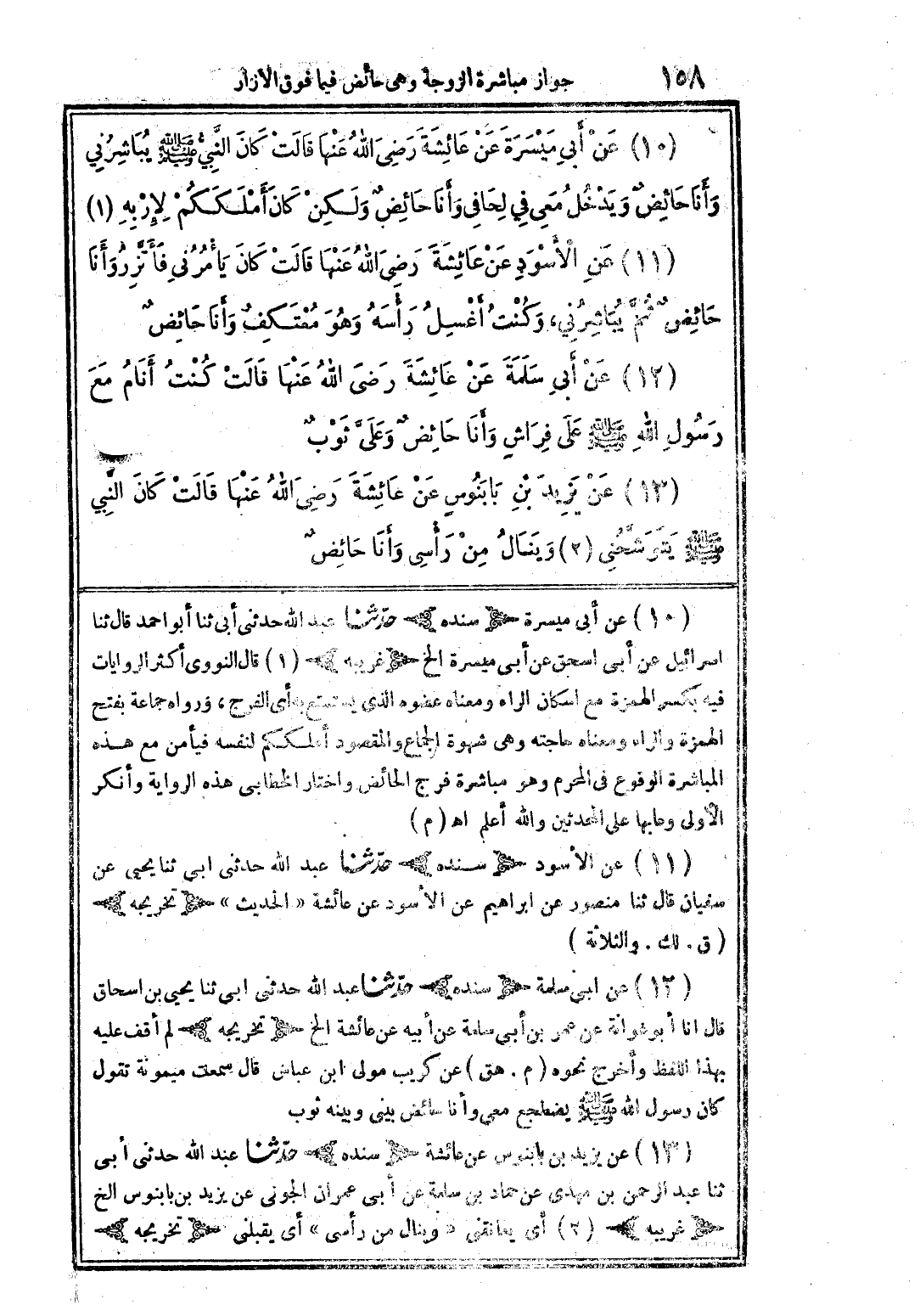 (10) عن أبي ميسرة عن عائشة رضى الله عنها قالت كان النَّبيُّ صلى الله عليه وسلم يباشرني وأنا حائض ويدخل معى في لحافى وأنا حائض ولكن كان أملككم لإربه