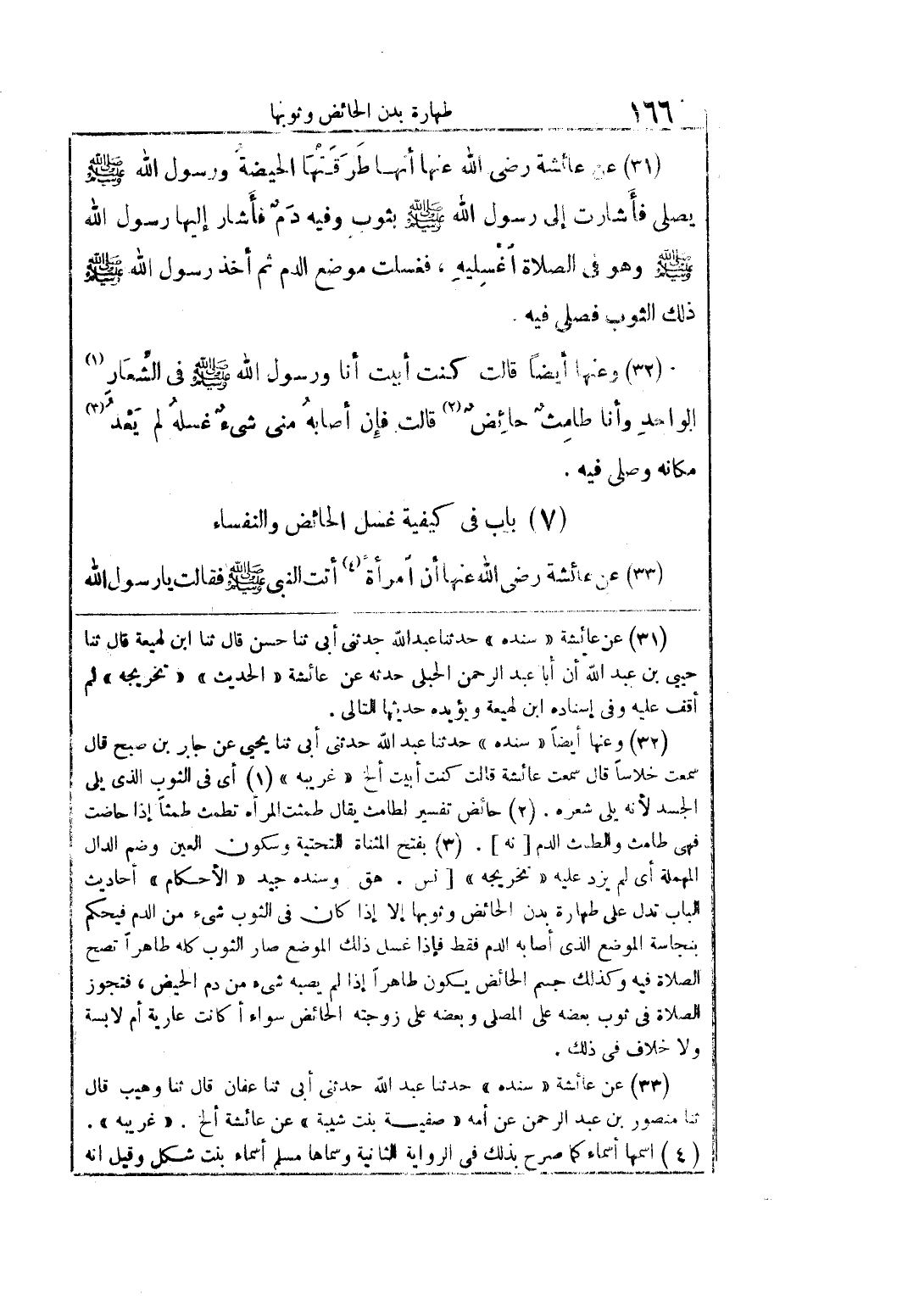 (32) وعنها أيضًا قالت كنت أبيت أنا ورسول الله صلى الله عليه وسلم في الشِّعار الواحد وأنا طامث حائض قالت فإن أصابه مني شيء غسله لم يعد مكانه وصلى فيه.