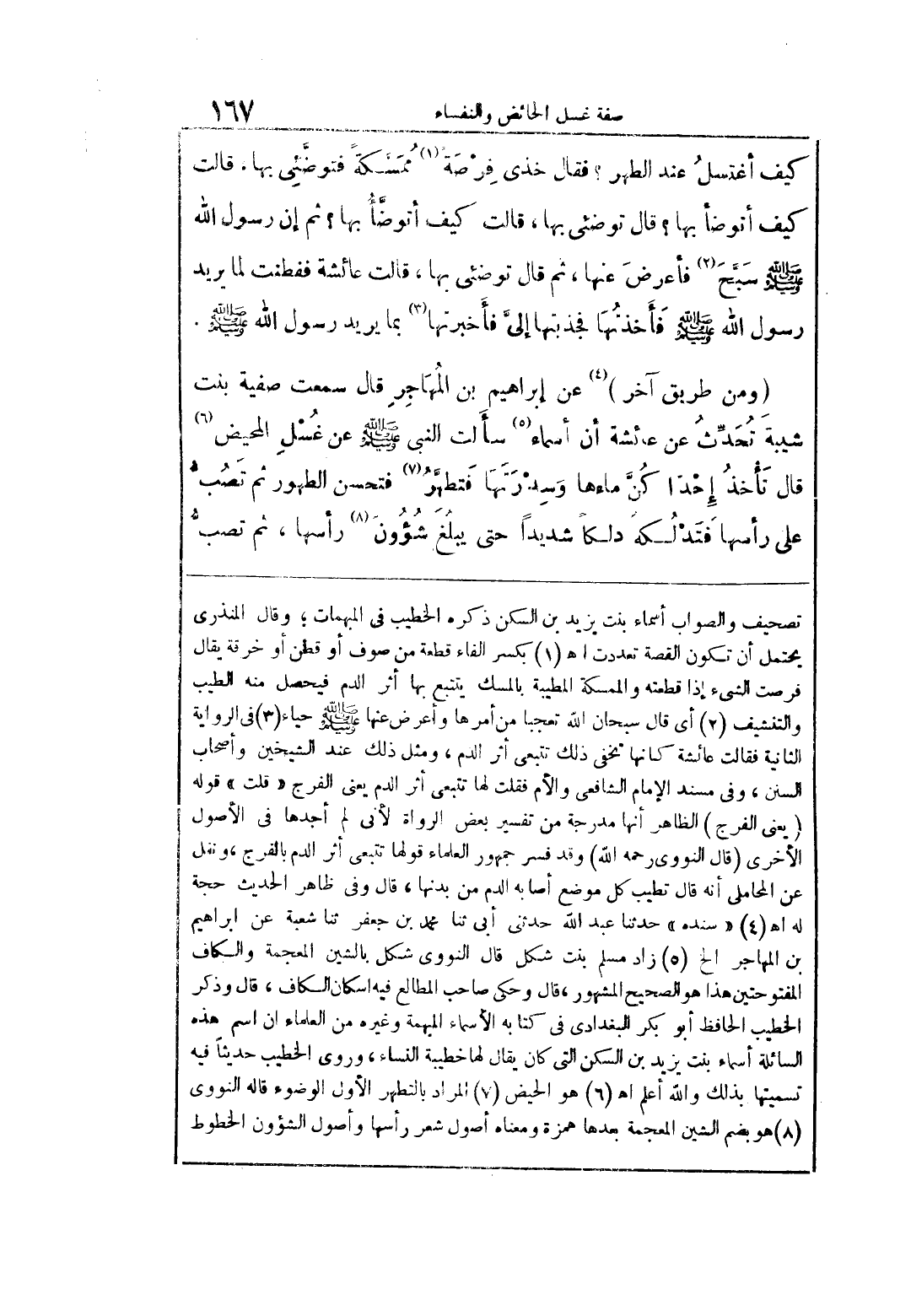 (ومن طريق آخر) عن إبراهيم بن المهاجر قال سمعت صفية بنت شيبة تحدّث عن عائشة أن أسماء سألت النبي صلى الله عليه وسلم عن غسل المحيض قال تأخذ إحداكنَّ ماءها وسدرتها فتطهّر فتحسن الطهور ثم تصبّ على رأسها فتدلكه دلكًا شديدًا حتى يبلغ شؤون رأسها، ثم تصبُّ