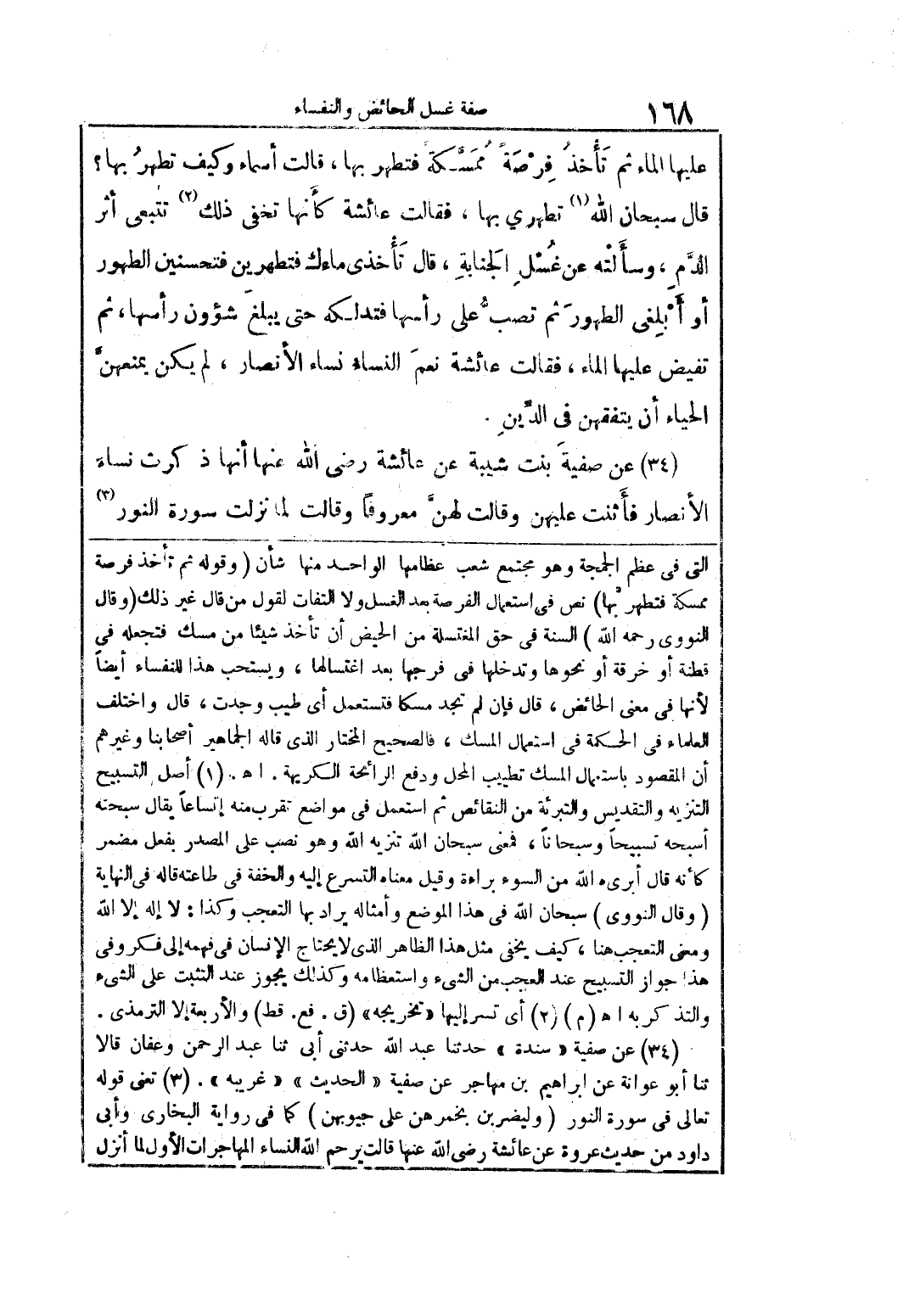 عليها الماء ثم تأخذ فرصة ممسَّكة فتطهر بها، قالت أسماء وكيف تطهر بها؟ قال سبحان الله تطهري بها، فقالت عائشة كأنها تخفي ذلك تتبعي أثر الدم، وسألته عن غسل الجنابة، قال تأخذي ماءك فتطهرين فتحسنين الطهور أو أبلغي الطهور ثم تصبّ على رأسها فتدلكه حتى يبلغ شؤون رأسها، ثم تفيض عليها الماء، فقالت عائشة نعم النساء نساء الأنصار، لم يكن يمنعهنَّ الحياء أن يتفقهن في الدِّين.