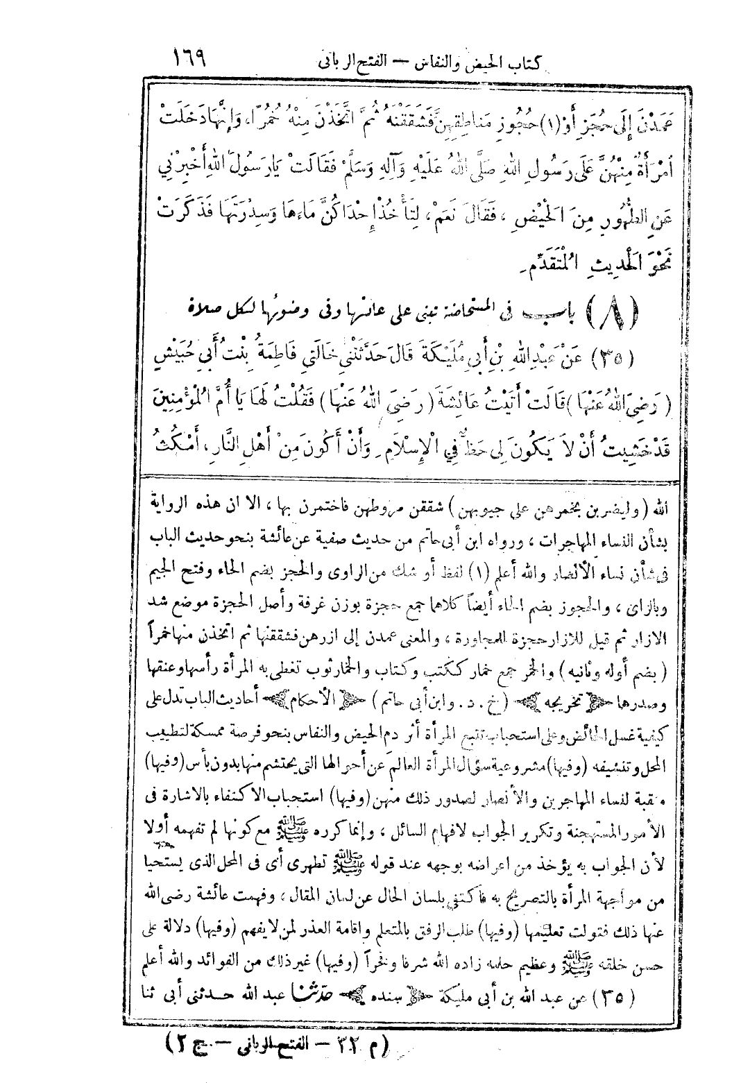الله (وليضربن بخمرهن على جيوبهن) شققن مروطهن فاختمرن بها، الا ان هذه الرواية بشأن النساء المهاجرات، ورواه ابن أبي حاتم من حديث صفية عن عائشة بنحو حديث الباب في شأن نساء الأنصار والله أعلم (1) لفظ أوشك من الراوي والحجز بضم الحاء وفتح الجيم وبالزاي، والحجوز بضم الحاء أيضًا كلاهما جمع حجزة بوزن غرفة وأصل الحجزة موضع شد الازار ثم قيل للازار حجزة للمجاورة، والمعنى عمدن إلى ازرهن فشققتها ثم اتخذن منها خمرًا (بضم أوله وثانيه) والخمر جمع خمار ككتب وكتاب والخمار ثوب تغطى به المرأة رأسها وعنقها وصدرها (تخريجه) (خ. د. وابن أبي حاتم) (الأحكام) أحاديث الباب تدل على كيفية غسل الحائض وعلى استحباب تتبع المرأة أثر دم الحيض والنفاس بنحو فرصة ممسكة لتطييب المحل وتنشيفه (وفيها) مشروعية سؤال المرأة العالم عن أحوالها التي يحتشم منها بدون بأس (وفيها) منقبة لنساء المهاجرين والأنصار لصدور ذلك منهن (وفيها) استحباب الاكتفاء بالاشارة في الأمور المستهجنة وتكرير الجواب لافهام السائل، وإنما كرره صلى الله عليه وسلم مع كونها لم تفهمه أولًا لأن الجواب به يؤخذ من اعراضه بوجهه عند قوله صلى الله عليه وسلم تطهري أي في المحل الذي يستحيا من مواجهة المرأة بالتصريح به فاكتفى بلسان الحال عن لسان المقال، وفهمت عائشة رضي الله عنها ذلك فتولت تعليمها (وفيها) طلب الرفق بالمتعلم وإقامة العذر لمن لا يفهم (وفيها) دلالة على حسن خلقة صلى الله عليه وسلم وعظيم حلمه زاده الله شرفًا وفخرًا (وفيها) غي ذلك من الفوائد والله أعلم