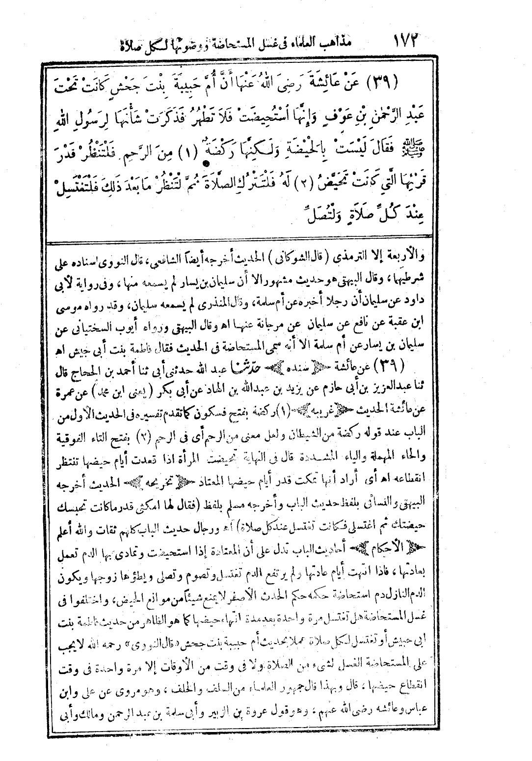 (39) عن عائشة رضي الله عنها أنَّ أمَّ حبيبة بنت جحش كانت تحت عبد الرّحمن بن عوف وإنَّها استحيضت فلا تطهر فذكرت شأنها لرسول الله صلى الله عليه وسلم فقال ليست بالحيضة ولكنها ركضة من الرحم فلتنظر قدر قرئها الَّتي كانت تحيَّض له فلتترك الصلاة ثمَّ لتنظر ما بعد ذلك فلتغتسل عند كلّ صلاةٍ ولتصلّ