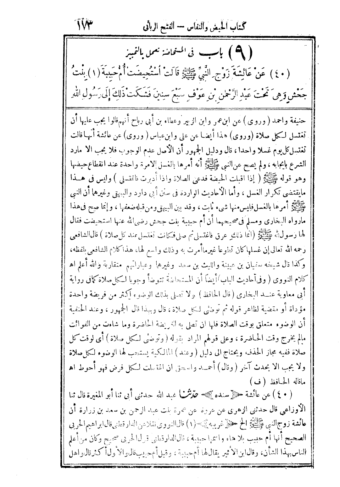 (40) عن عائشة زوج النَّبيِّ صلى الله عليه وسلم قالت استحيضت أمُّ حبيبة بنت جحشٍ وهي تحت عبد الرَّحمن بن عوف سبع سنين فشكت ذلك إلى رسول الله
