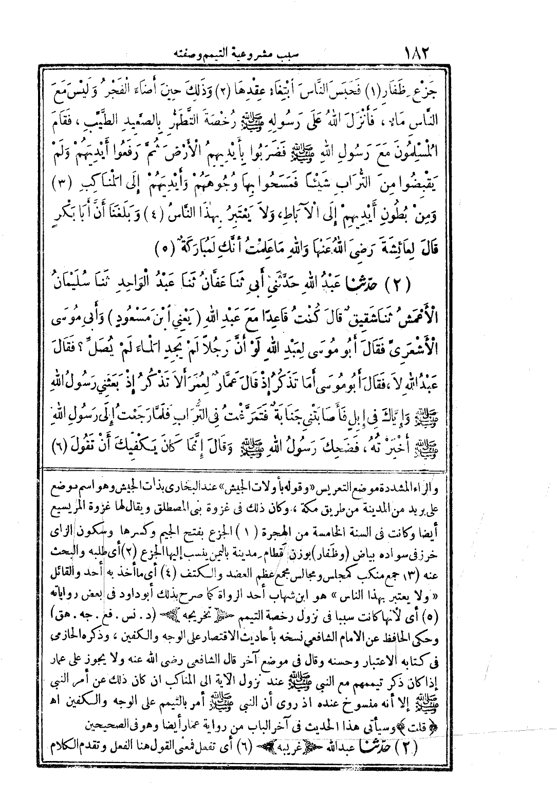 والراء المشددة موضع التعريس "وقوله بأولات الجيس" عند البخاري بذات الجيش وهو اسم موضع على بريد من المدينة من طريق مكة، وكان ذلك في غزوة بنى المصطلق ويقال لها غزوة المريسيع أيضًا وكانت في السنة الخامسة من الهجرة (1) الجزع بفتح الجيم وكسرها وسكون الزاي خرزفي في سواده بياض (وظفار) بوزن قطام مدينة باليمين ينسب إليها الجزع (2) أي طلبه والبحث عنه (3) جمع منكب كمجلس ومجالس مجمع عظم العضد والكتف (4) أي ما أخذ به أحد والقائل "ولا يعتبر بهذا الناس" هو ابن شهاب أحد الرواة كما صرح بذلك أبو داود في بعض رواياته (5) أي لأنها كانت سببًا في نزول رخصة التيمم (تخريجه) (د. نس. فع. جه. هق) وحكى الحافظ عن الامام الشافعي نسخة بأحاديث الاقتصار على الوجه والكفين، وذكرها الحازمى في كتابه الاعتبار وحسنه وقال في موضع آخر قال الشافعي رضى اله عنه ولا يجوز على عمار إذا كان ذكر تيممهم مع النبي صلى الله عليه وسلم عند نزول الآية الى المناكب ان كان ذلك عن امر النبي صلى الله عليه وسلم إلا أنه منسوخ عنده اذ روى أن النبي صلى الله عليه وسلم أمر بالتيمم على الوجه والكفين اه (قلت) وسيأتى هذا الحديث في آخر الباب من رواية عمار أيضًا وهو في الصحيحين.