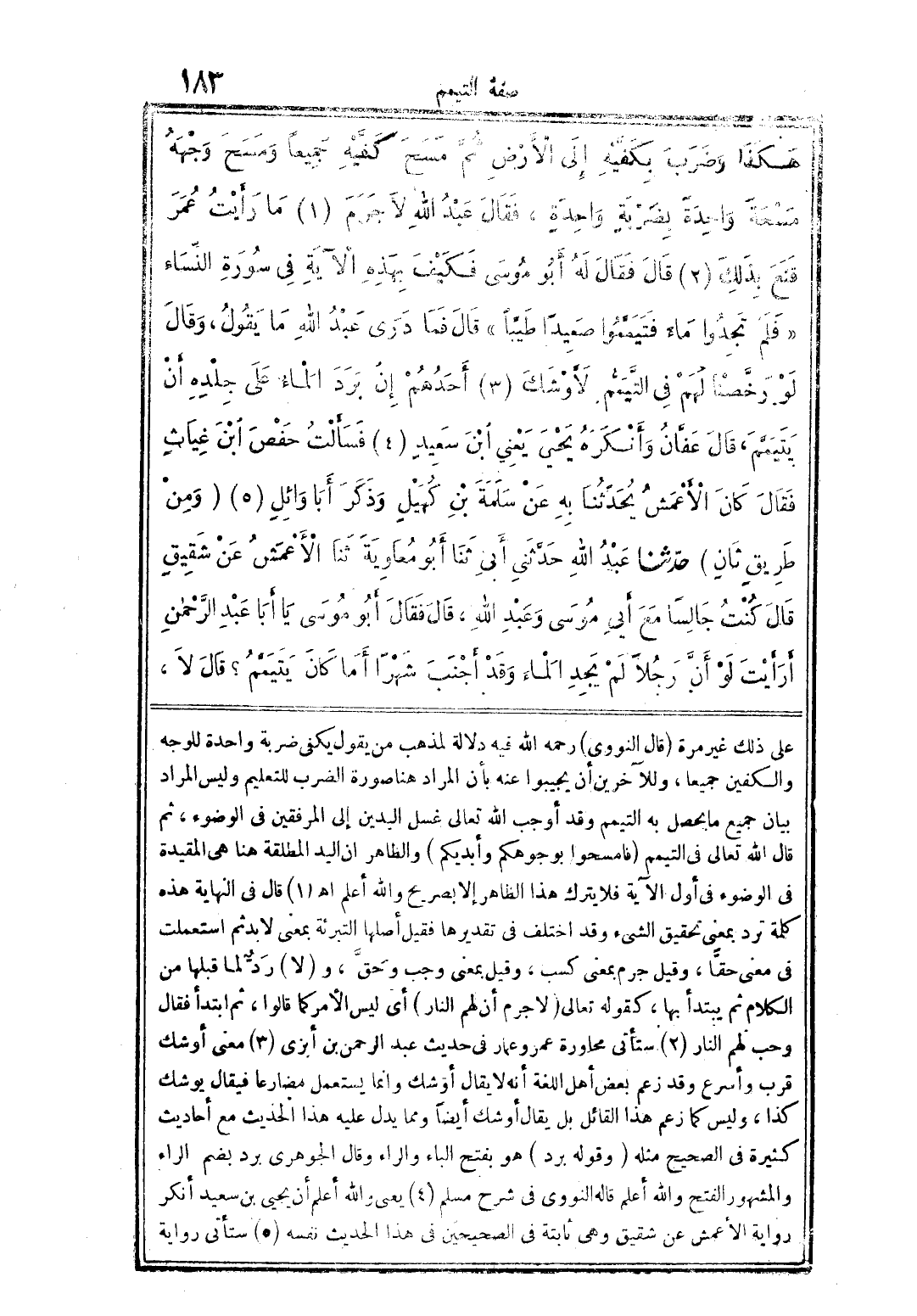 على ذلك غير مرة (قال النووي) رحمه الله فيه دلالة لمذهب من يقول يكفى ضربة واحدة للوجه والكفين جميعًا، وللآخرين أن يجيبوا عنه بأن المراد هنا صورة الضرب للتعليم وليس المراد بيان جميع ما يحصل به التيمم وقد أوجب الله تعالى غسل اليدين إلى المرفقين فى الوضوء، ثم قال الله تعالى فى التيمم (فامسحوا بوجوهكم وأيديكم) والظاهر أن اليد المطلقة هنا هى المقيدة فى الوضوء فى أول الآية فلا يترك هذا الظاهر إلا بصريح والله أعلم اهـ/1) قال فى النهاية هذه كلمة ترد بمعنى تحقيق الشئ وقد اختلف فى تقديرها فقيل أصلها التبرئة بمعنى لا بد ثم استعملت فى معنى حقًّا، وقيل جرم بمعنى كسب، وقيل بمعنى وجب وحقَّ، و (لا) رد لما قبلها من الكلام ثم يبتدأ بها، كقوله تعالى (لا جرم أن لهم النار) أي ليس الأمر كما قالوا، ثم ابتدأ فقال وحب لهم (2) ستأتى محاورة عمر وعمار في حديث عبد الرحمن بن أبزى (3) معنى أوشك قرب وأسرع وقد زعم بعض أهل اللغة أنه لا يقال أوشك وإنما يستعمل مضارعًا فيقال يوشك كذا، وليس كما زعم هذا القائل بل يقال أوشك أيضًا ومما يدل عليه هذا الحديث مع أحاديث كثيرة فى الصحيح مثله (وقوله برد) هو بفتح الباء والراء وقال الجوهري برد بضم الراء والمشهور الفتح والله أعلم قاله النووى فى شرح مسلم (4) يعنى والله أعلم أن يحيى بن سعيد أنكر رواية الأعمش عن شقيق وهى ثابتة في الصحيحين فى هذا الحديث نفسه (5) ستأتي رواية