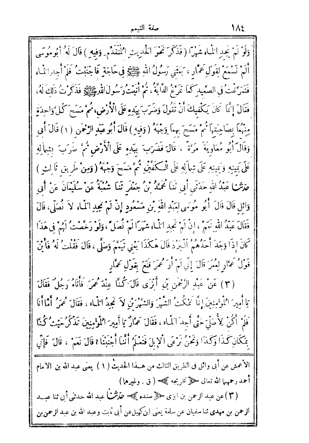 (3) عن عبد الرحمن بن أبرى قال كنَّا عند عمر فأتاه رجل فقال يا أمير المؤمنين إنّا نمكث الشَّهر والشَّهرين لا نجد الماء: فقال عمر أمَّا أنا لم أكن لأصلِّي حتَّى أجد الماء، فقال عمَّار يا أمير المؤمنين تذكر حيث كنَّا بمكان كذا وكذا ونحن نرعى الإبل فتعلم أننا أجنبنا؟ قال نعم، قال فإني